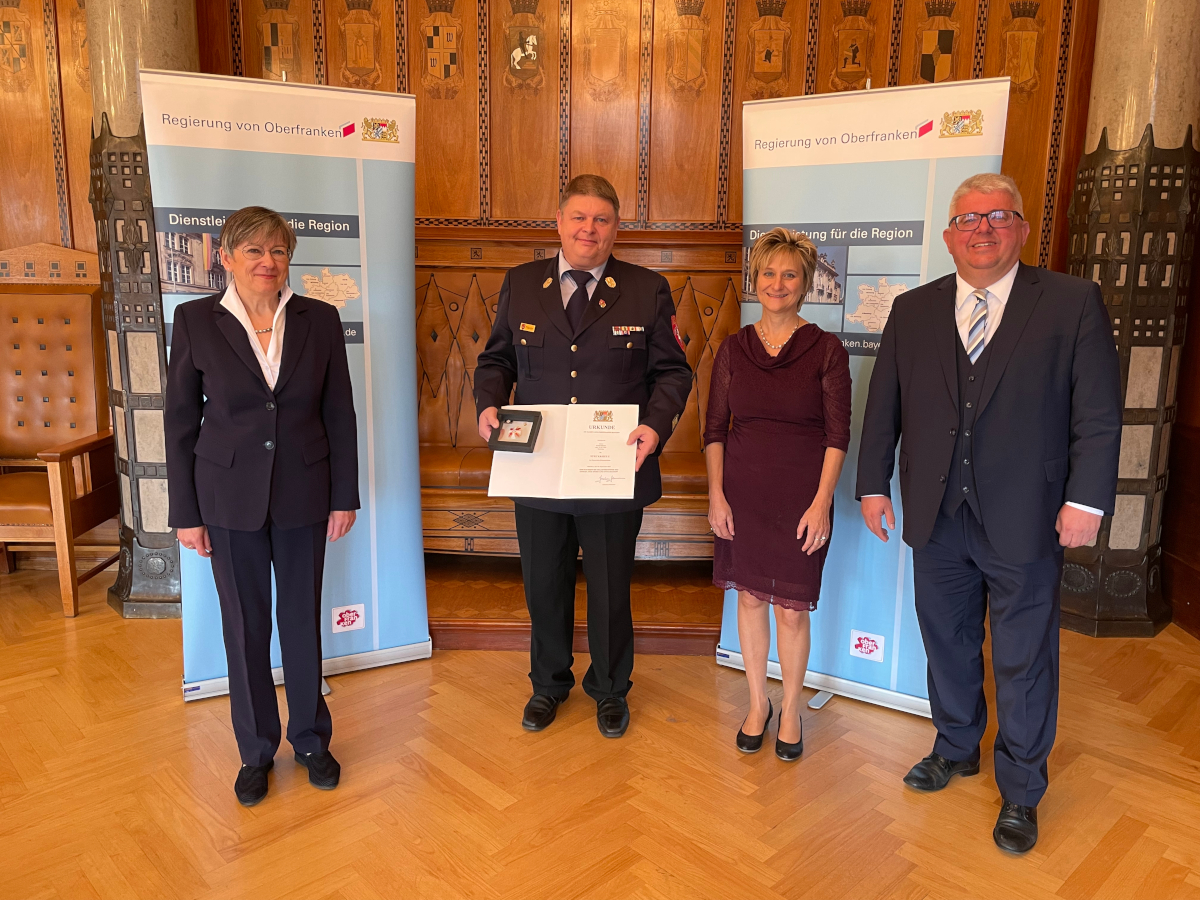Nach seiner Ehrung mit dem Deutschen Feuerwehr-Ehrenkreuz in Silber am 25.03.2011 und dem Feuerwehr-Ehrenkreuz für 40-jährige aktive Dienstzeit am 16.03.2018, wurde ihm nun am 25.10.2021 von Regierungspräsidentin Heidrun Piwernetz im Auftrag des Staatsminister des Innern, für Sport und Integration, Herrn Joachim Herrmann, das Steckkreuz als höchstes Ehrenzeichen "für besondere Verdienste um das Feuerwehrwesen oder bei der Bekämpfung von Bränden oder sonstigen Notständen" würdevoll verliehen.