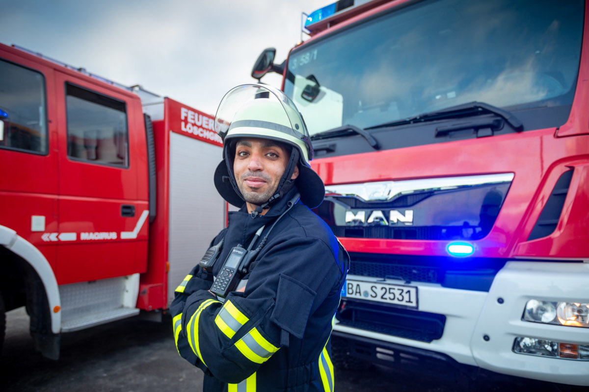 Nun wurde auch ein Kamerad aus Bamberg ausgewählt, welcher bayernweit für die Kampagne, aber auch und vor allem für die Wehren werben soll. Mahmoud „Manu“ ist Quereinsteiger mit Migrationshintergrund, welcher selbst aus seiner Heimat die Bedeutung und die damit einhergehenden Rahmenbedingungen eines Ehrenamtes nicht kannte. Er wollte und will aber Menschen helfen. In seiner Heimat Kairo (Ägypten) gibt es ein solches System nicht; ehrenamtliche Tätigkeiten sind dort unvorstellbar. Als ihn eine Arbeitskollegin auf die Feuerwehr Bamberg und das Ehrenamt ansprach, wunderte er sich zwar über das System, fand die Grundidee aber genau passend: Menschen in jeglicher Not helfen! Nach wenigen Probebesuchen, noch vor der Pandemie, wusste er, dass dies genau das Richtige für ihn sei und trat der Freiwilligen Feuerwehr Bamberg in der Löschgruppe 2 – Wunderburg bei. Leider kam ihm während seiner Grundausbildung die Corona-Pandemie dazwischen, aber er ist fest entschlossen die sogenannte Modulare Truppausbildung „MTA“ (Grundausbildung), als auch den Atemschutzgeräteträger-Lehrgang zu absolvieren und abzuschließen. Manu ist begeisterter Feuerwehrmann, welcher immer Menschen in Not helfen möchte und das Ehrenamt gemeinsam mit seinen Kameradinnen und Kameraden lebt.