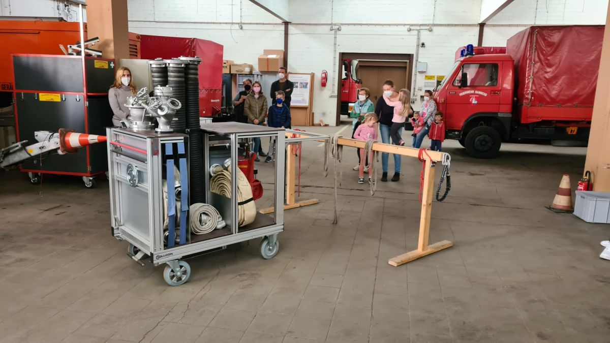 Dritte Station auf der Radeltour war die gemeinsame Gerätehalle der „Löschgruppe 2 / Jugendfeuerwehr“ in der Rotensteinstraße am Münchner Ring. Begrüßt wurden die Besucher durch den Stadtbrandinspektor Ewald Pfänder, sowie die beiden stellvertretenden Löschgruppenführer Martina Moyano, erste weibliche Führungskraft in Bamberg, und Thomas Schippert. An dieser Stelle zeigte eine Abordnung der Jugendgruppe in Gruppenstärke (bei der Feuerwehr „1/8“, sprich 9 Personen) eine eindrucksvolle Showübung mit Löschangriff im Freien und damit einen Auszug ihres Könnens. Anhand ihres Tragkraftspritzenanhängers wurde der Wasseraufbau für den Löschangriff abgearbeitet. Anschließend konnte das Gerätehaus noch durch die Teilnehmerinnen und Teilnehmer besichtigt werden. Dieses Gebäude ist das zweitneueste Feuerwehrgerätehaus und stellt den heutigen zeitgemäßen modernen Stand einer städtischen Feuerwehr dar.