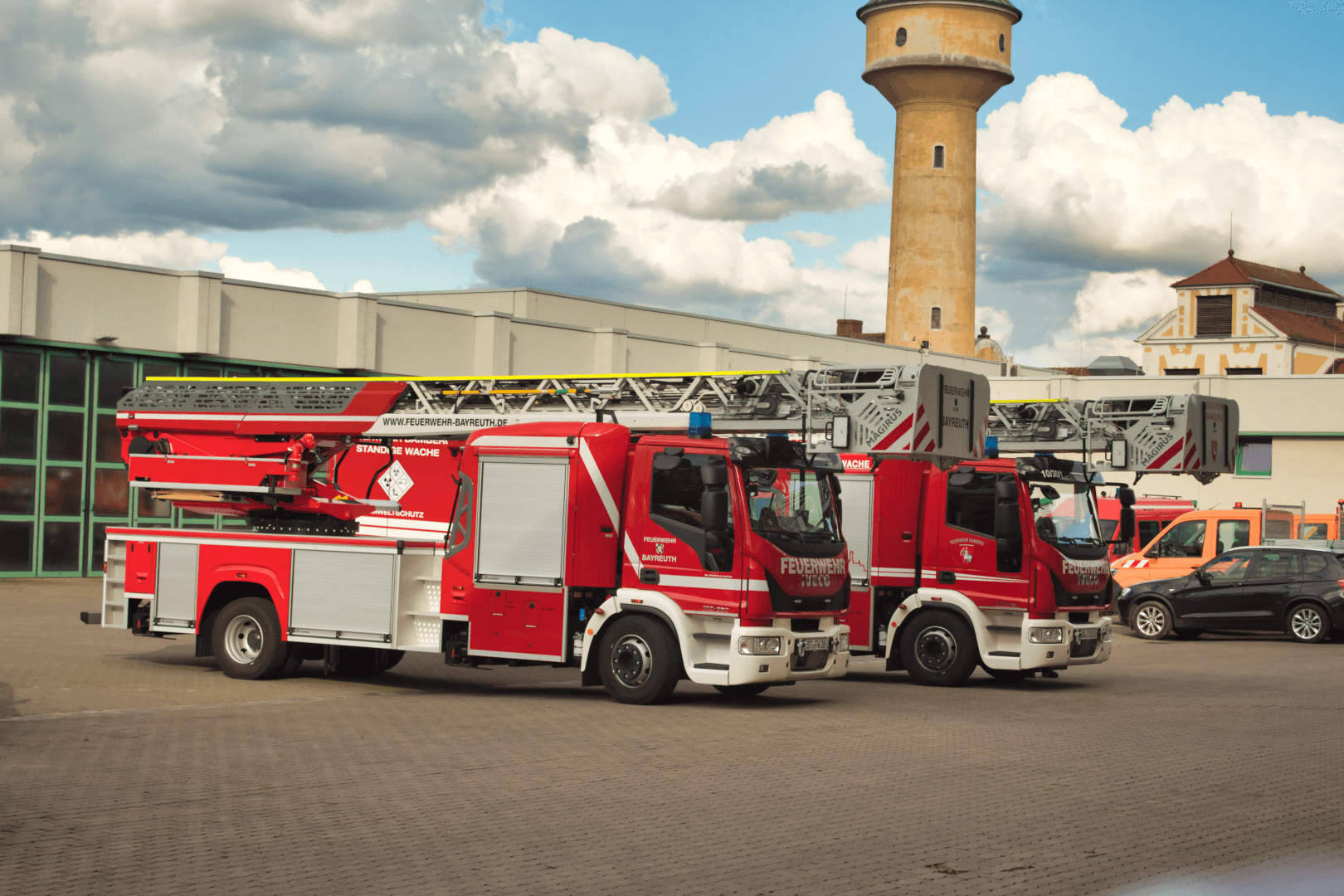 Nachdem Kameraden der Ständigen Wache über zwei Tage im Magirus-Werk in Ulm eine Einweisung erhielten, versammelten sich ca. 80 Kameradinnen und Kameraden im Innenhof der Ständigen Wache um das neue Fahrzeug gebührend in Empfang zu nehmen. Nun war es endlich soweit: „Der Fuhrpark der Feuerwehr Bamberg kann mit diesem modernen und schlagkräftigen Hubrettungsfahrzeug wieder auf den erforderlichen Bedarf gehoben werden“, präsentierte Stadtbrandrat Florian Kaiser die neue Drehleiter nach Ankunft beim Empfang auf der Ständigen Wache. Dadurch, dass es sich um eine interkommunale Beschaffung mit der Stadt Bayreuth handelt, kehrten deren Kameraden mit ihrer neuen, baugleichen Drehleiter kurzweg mit in Bamberg ein und nutzen diese Gelegenheit für eine kurze Lenkpause.