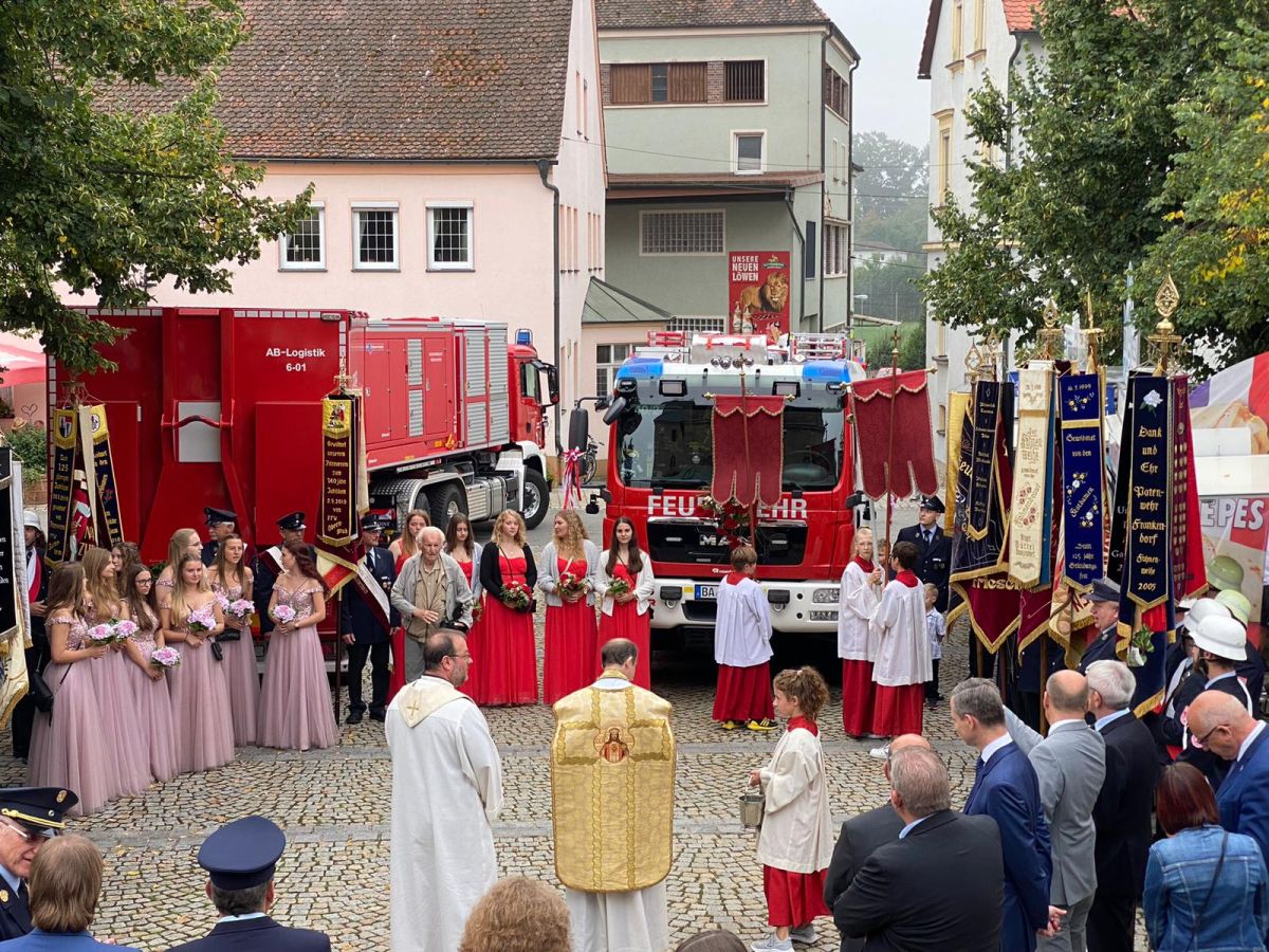 Bei gleich zwei besonderen kirchlichen Festen war die Freiwillige Feuerwehr Bamberg am Sonntag, den 21. August 2022 vertreten. Die Corpsfahne nahm mit einer Abordnung an der großen Muttergottesprozession teil, an der die freudenreiche Muttergottes-Statue der Oberen Pfarre die Darstellung der schmerzhaften Muttergottes von St. Martin besucht.