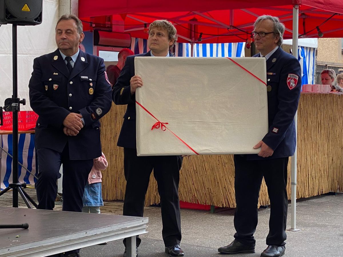 Herr Bürgermeister Karmann durfte auch zahlreiche Vertreter der Politik wie Herrn Landrat Johann Kalb, Herrn Landtagsabgeordneten Holger Dremel sowie die beiden Bundestagsabgeordneten Herrn Andreas Schwarz und Herrn Thomas Silberhorn begrüßen. Den besonderen Rahmen nutzend, übergab die Freiwillige Feuerwehr Bamberg das von aus den eigenen Reihen stammenden Kamerad Peter Maierhofer bereits im Frühjahr 2020 gefertigte Gemälde „Patenfeuerwehren Buttenheim und Bamberg – 150 Jahre Feuerwehr Buttenheim“. Dieses wollte man eigentlich anlässlich des Gründungsjubiläums übergeben. Das Fest zum Jubiläum unserer Patenwehr fiel 2020 leider aufgrund der Pandemie aus.