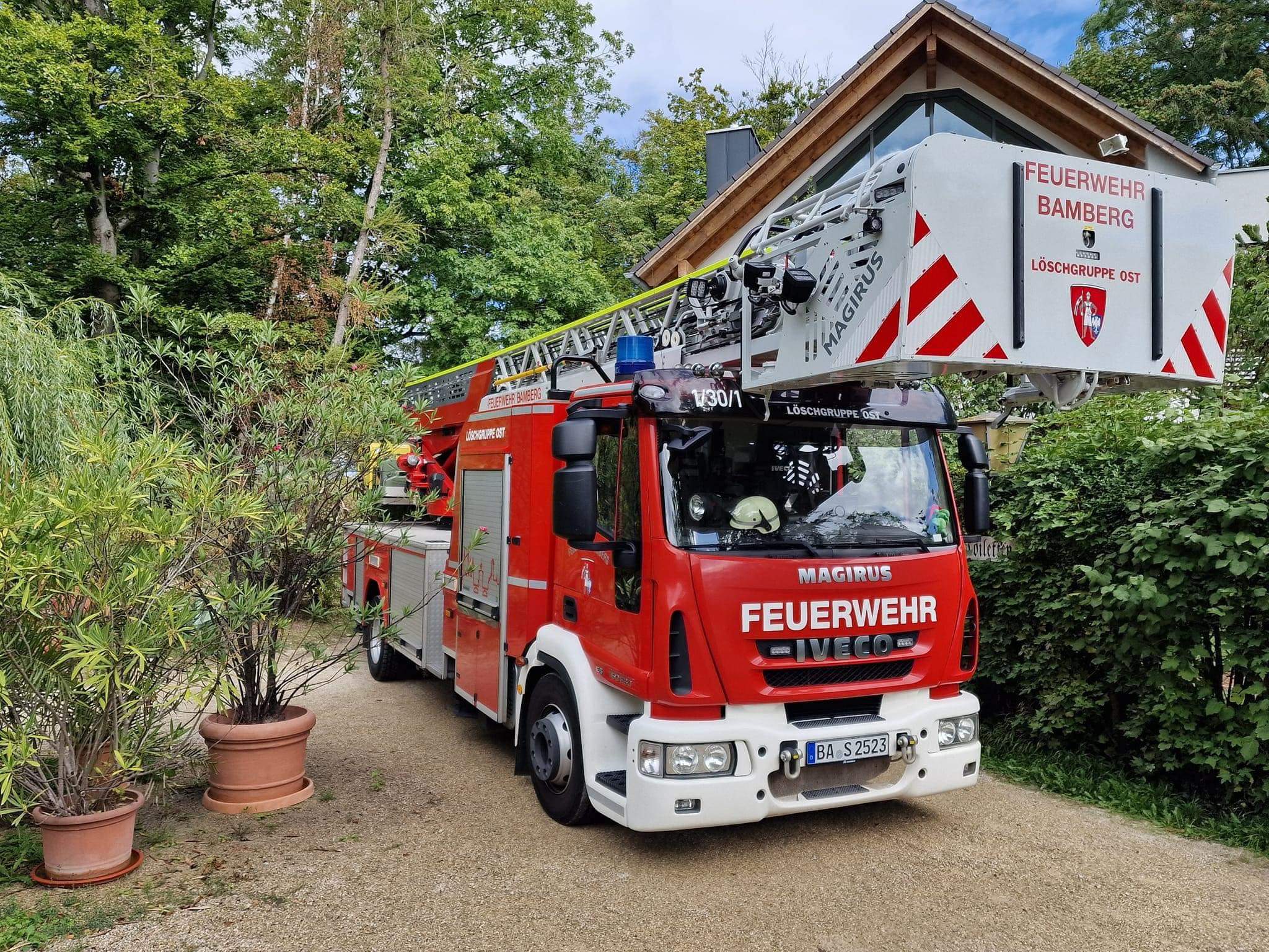 Dank der Löschgruppe 1 – Ost konnte man der Wirtfamilie Konrad ein besonderes Geschenk machen: man hob sie mittels der Drehleiter über deren Biergarten, damit sie sowohl ihren Garten als auch die Stadt Bamberg aus 30 Meter Höhe betrachten konnten.