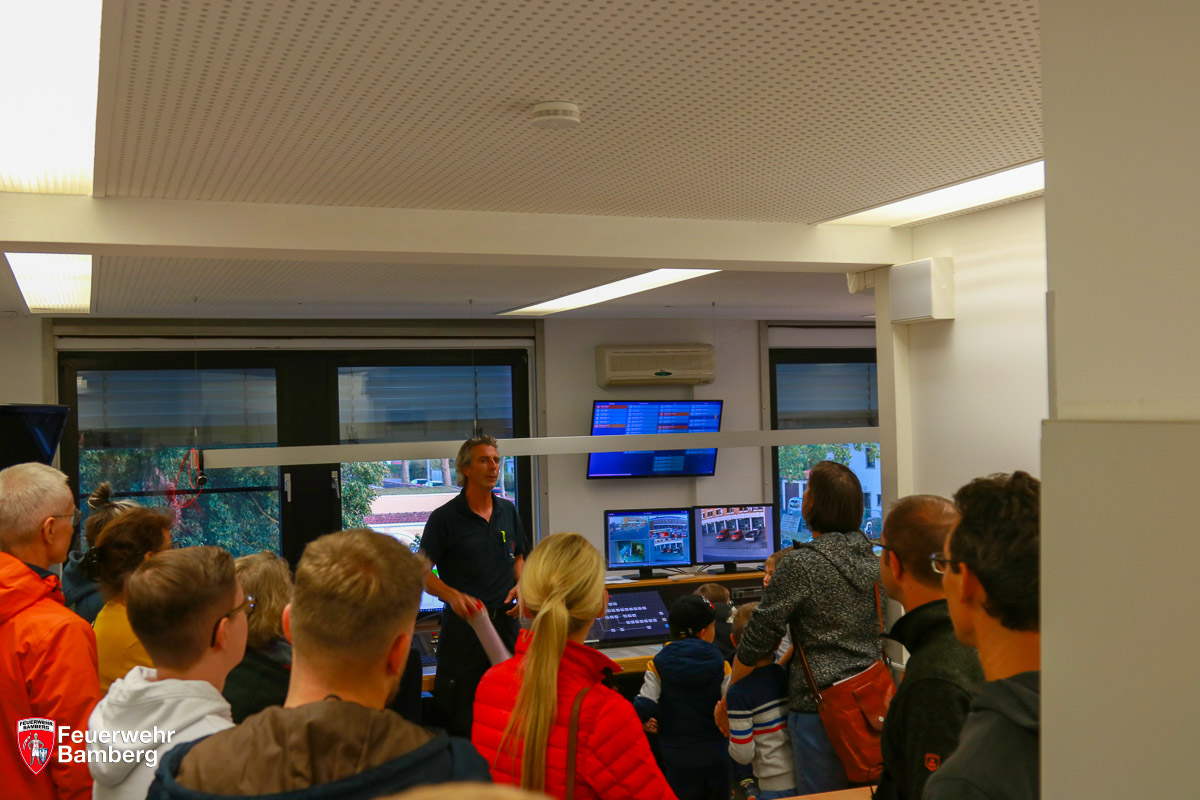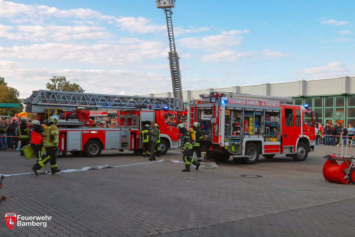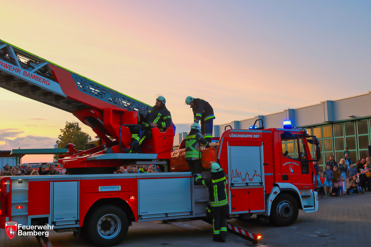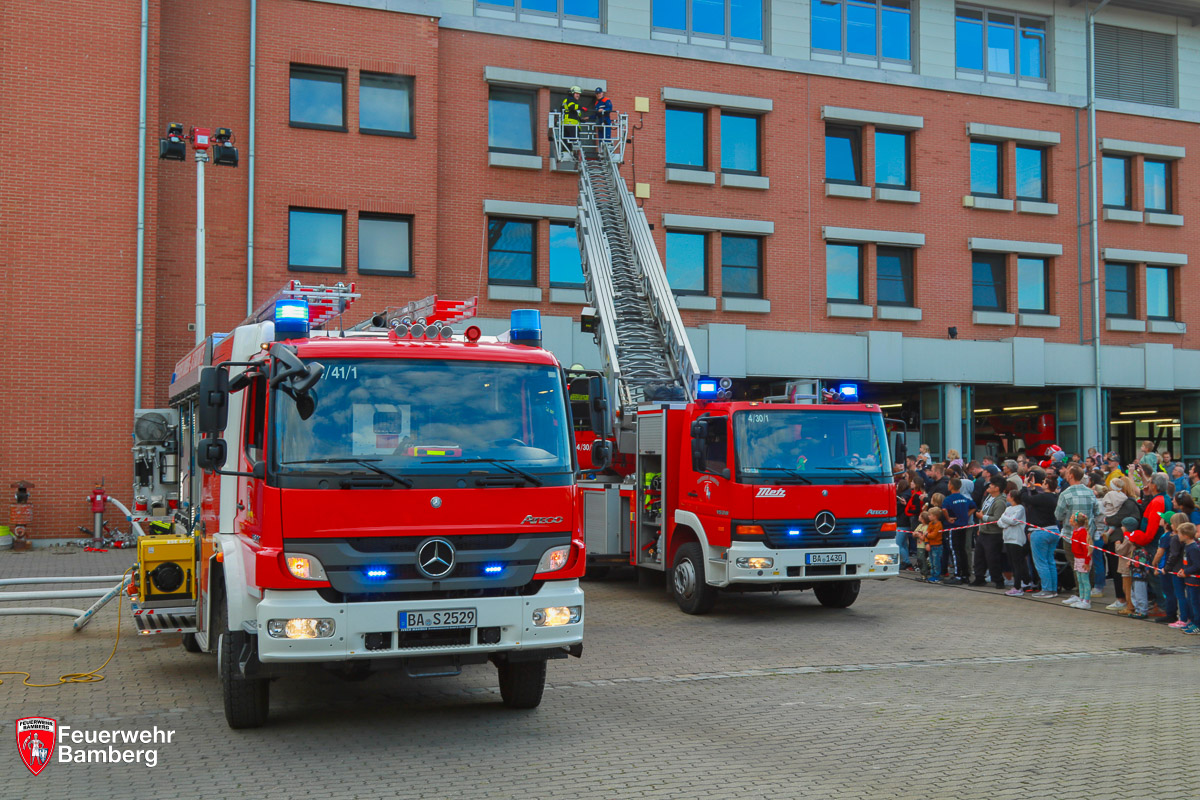 Um den Interessierten auch Einblicke in den Hauptberuf der Feuerwehrfrau/dem Feuerwehrmann zu gewähren, boten die Beamten der Ständigen Wache zu jeder halben Stunde eine Führung durch das Dienstgebäude Margaretendamm an. Zu jeder vollen Stunde hieß es „Einsatz für die Feuerwehr Bamberg!“. Unter der Moderation von Mit-Organisator Oliver Eßel startete die erste Darstellung. Ein für das Aufgabengebiet der Feuerwehr typischer Einsatz: Zimmerbrand mit Personen in Gefahr. Die Kameradinnen und Kameraden rückten an und zeigten ihr Können zur Menschenrettung über die Drehleiter und der Brandbekämpfung unter schwerem Atemschutz.