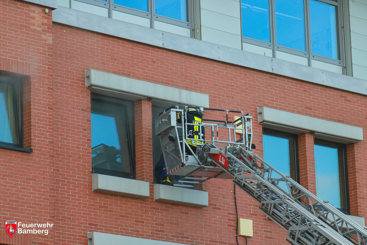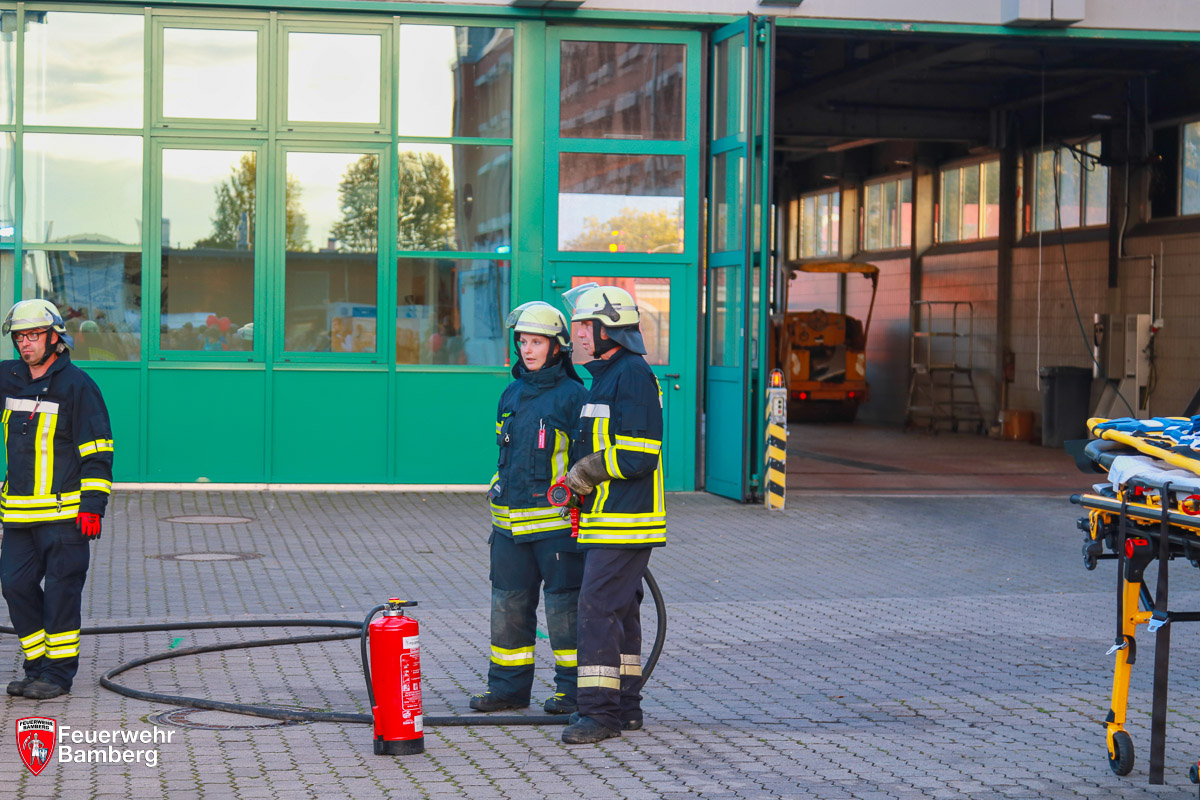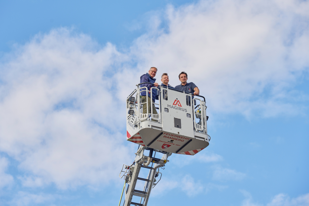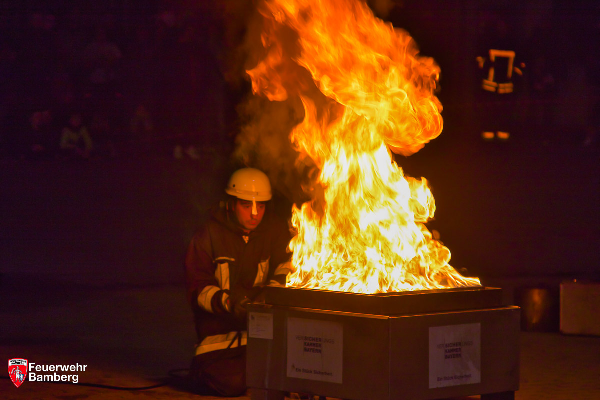 Um den Interessierten auch Einblicke in den Hauptberuf der Feuerwehrfrau/dem Feuerwehrmann zu gewähren, boten die Beamten der Ständigen Wache zu jeder halben Stunde eine Führung durch das Dienstgebäude Margaretendamm an. Zu jeder vollen Stunde hieß es „Einsatz für die Feuerwehr Bamberg!“. Unter der Moderation von Mit-Organisator Oliver Eßel startete die erste Darstellung. Ein für das Aufgabengebiet der Feuerwehr typischer Einsatz: Zimmerbrand mit Personen in Gefahr. Die Kameradinnen und Kameraden rückten an und zeigten ihr Können zur Menschenrettung über die Drehleiter und der Brandbekämpfung unter schwerem Atemschutz.