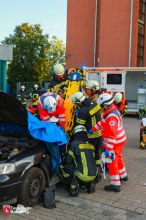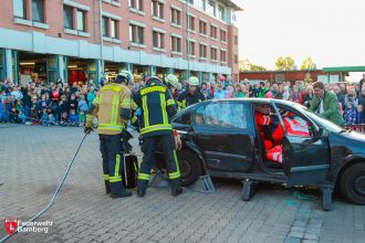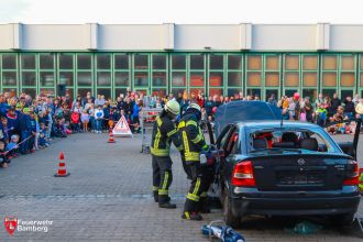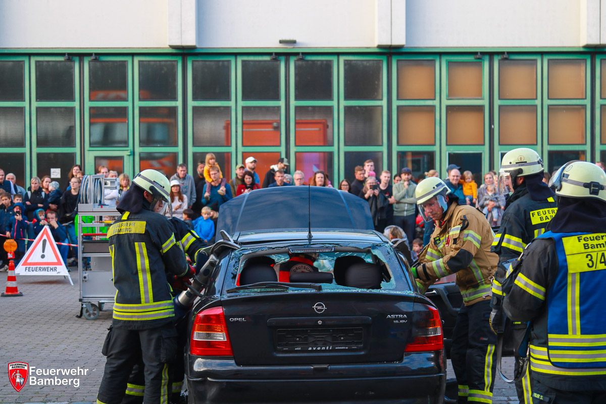 Zur nächsten vollen Stunde wurde ein Verkehrsunfallszenario mit einer eingeklemmten Person in Zusammenarbeit mit dem Bamberger BRK gezeigt. Neben den Tätigkeiten der Feuerwehr zeigte sich hier die reibungslose Zusammenarbeit zwischen Feuerwehr und Rettungsdienst. Eine gegenseitige Koordination der beiden Organisationen, ein sicheres Bedienen der schweren Gerätschaften und die Fertigkeiten der Einsatzkräfte, führten letztlich zur Befreiung und Versorgung der verunfallten Person.