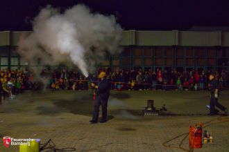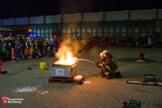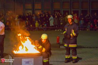 Mit Einbruch der Dunkelheit wurde es feurig. Wie funktioniert ein Feuerlöscher? Was ist der Unterschied zwischen einem Wasser- und CO2-Löscher? Eindrucksvoll demonstrierten zwei Kameraden die richtige Vorgehensweise der unterschiedlichen Fabrikate bei echten Flammen. Für große Augen sorgte die vorgeführte Fettexplosion, welche die Folge von Wassereinsatz bei einem Fettbrand sein kann. Diese erhellte kurzerhand die Übungsfläche. „Schaumparty!“ hieß es im Anschluss. Wobei hier weniger die Feierlichkeit im Vordergrund steht. Schaum entzieht einem Feuer den notwendigen Sauerstoff, weshalb es in Folge erstickt. Daher ist es bei gewissen Bränden ein extrem hilfreiches Mittel zur Brandbekämpfung. Auch dies wurde in verschiedenen Varianten eindrucksvoll vorgeführt und präsentiert.