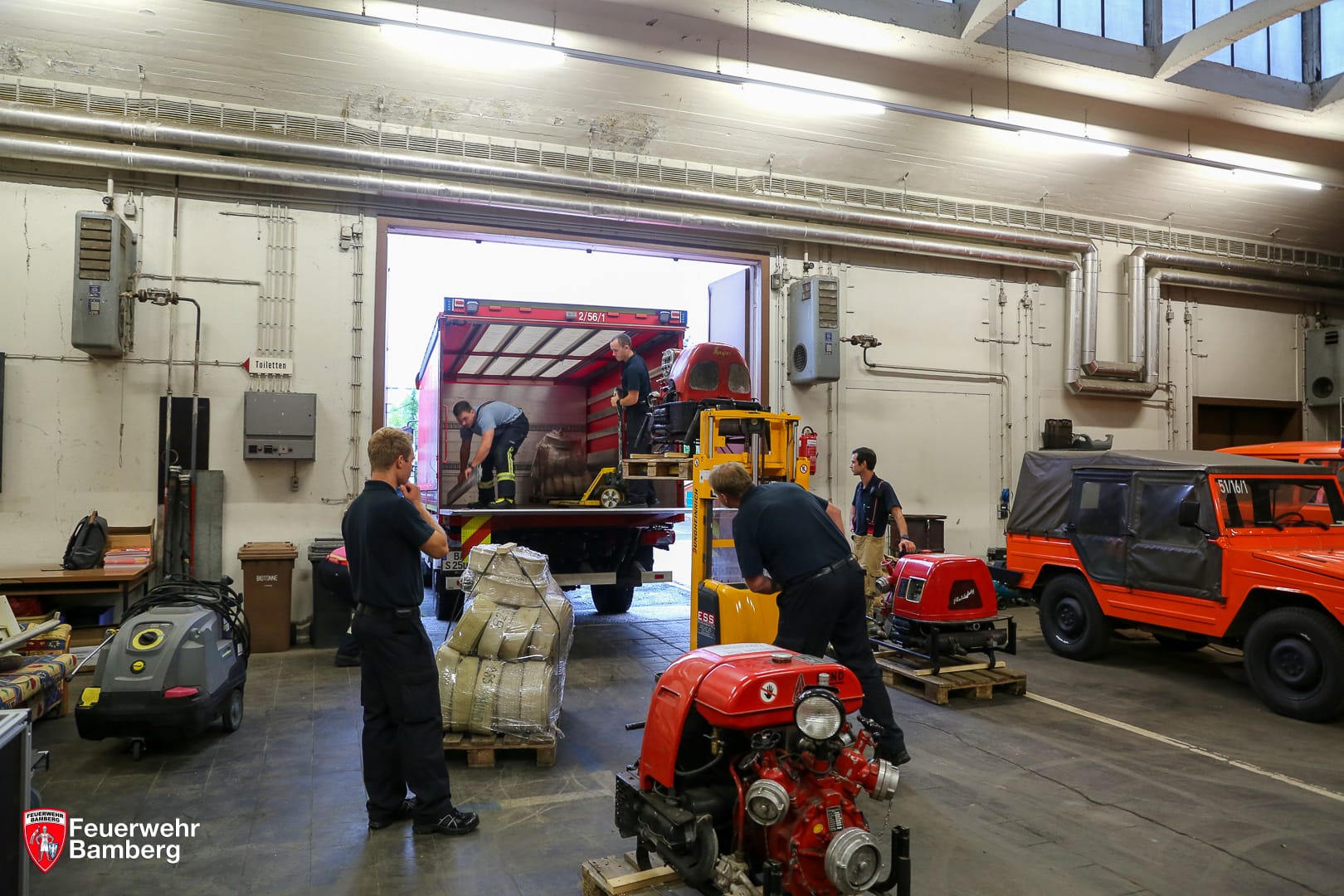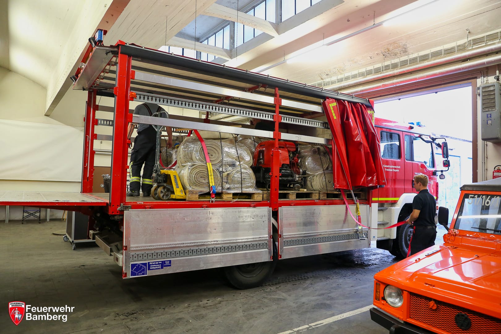 Nachdem auch der Stadtrat Bamberg grünes Licht für die Sachspende gegeben hat, konnten vergangene Woche etliche Gegenstände verladen werden. So wurden durch die Kameradinnen und Kameraden der Ständigen Wache und der Löschgruppe Wunderburg auszugsweise mehrere hundert Meter Schlauchmaterial, drei Tragkraftspritzen, Schlauchtragekörbe, Armaturen und persönliche Schutzausrüstung in den Gerätewagen gepackt.