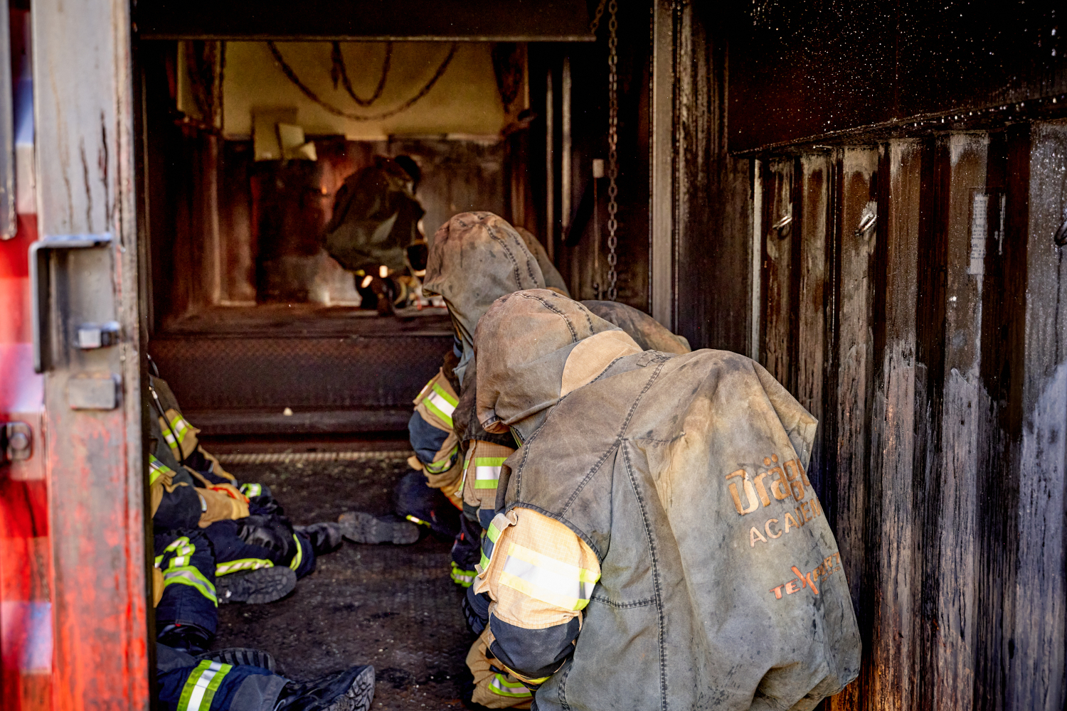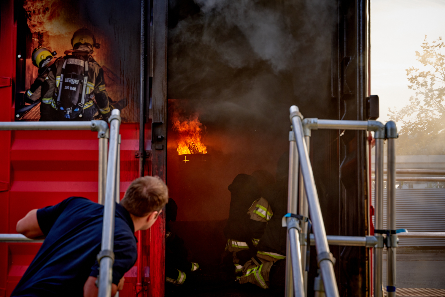 Voll ausgerüstet mit Schutzkleidung, Atemschutzgerät und Schutzoverall ging es dann heiß her! „Auf geht’s in den Brandraum!“, ließ der Ausbilder der Firma Dräger, welcher die Ausbildung leitet, verlauten.