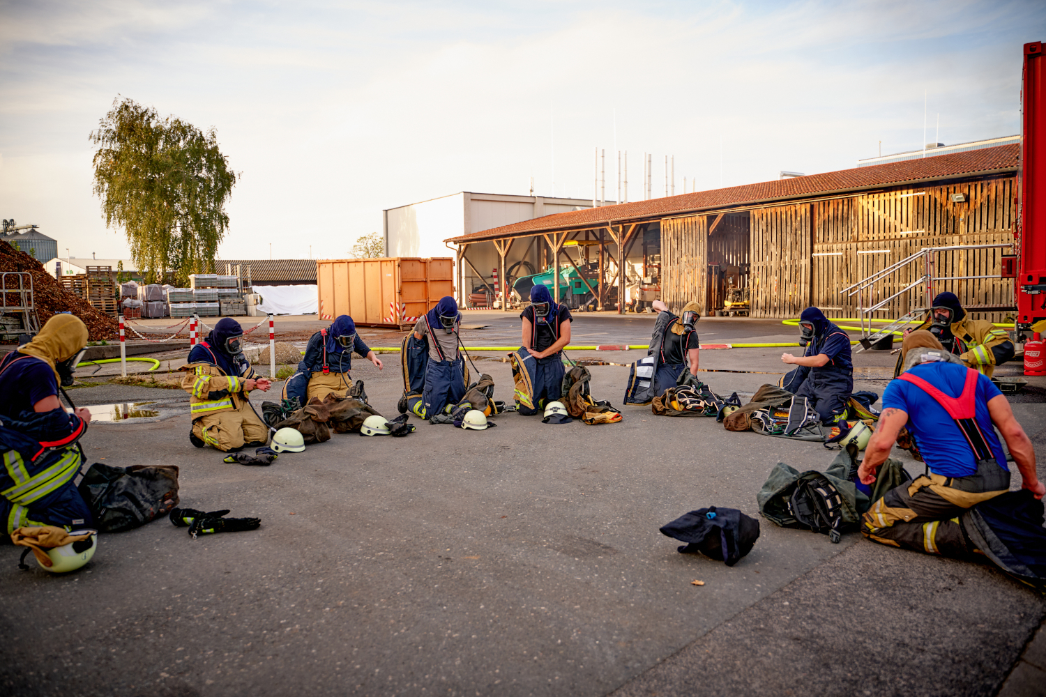 Nach dem etwa 20-minütigen Aufenthalt im Brandcontainer ging es auch wieder in den Außenbereich. Das richtige Entkleiden der mit Rauchgasen und Ruß kontaminierten Schutzkleidung wurde besprochen und gemeinsam beübt. Auch dieser, vielleicht augenscheinlich „uninteressante“ Teil, ist äußerst wichtig für die Feuerwehrleute. Denn der Gesundheitsschutz der Einsatzkräfte steht an oberster Stelle! Durch das richtige Entkleiden soll verhindert werden, dass Dreck, Rauch, Ruß „verschleppt“ oder im Echteinsatz gegebenenfalls sogar bis nach Hause zu den Familien gebracht wird.