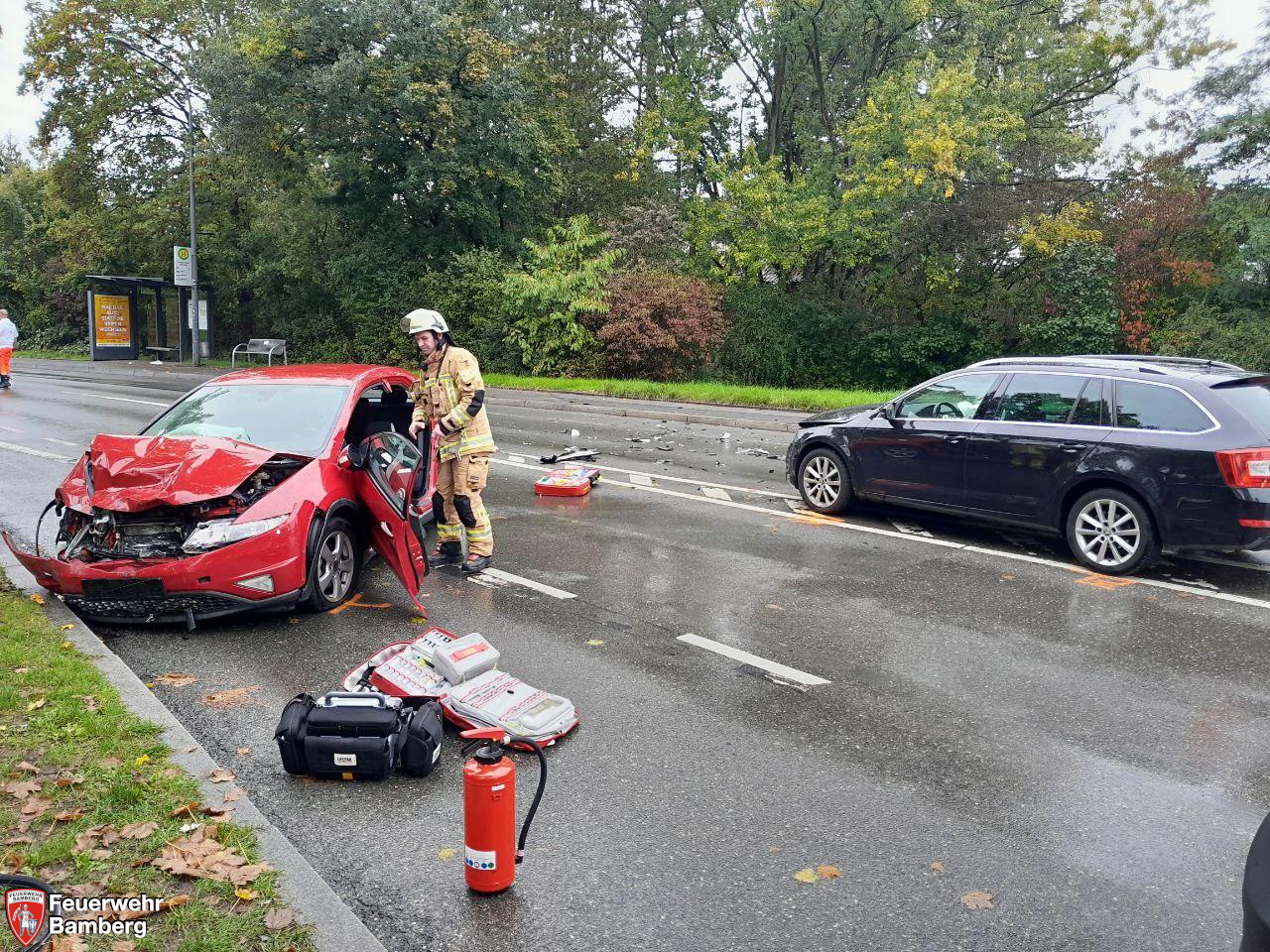 Die Feuerwehr Bamberg wurde gegen Mittag zu einem Verkehrsunfall mit Verletzten in die Würzburger Straße alarmiert. Auf Höhe des REWE-Marktes stießen zwei Pkw frontal zusammen. Aufgrund eines medizinisches Problemes verlor ein Fahrzeugführer die Kontrolle und geriet in den Gegenverkehr.
