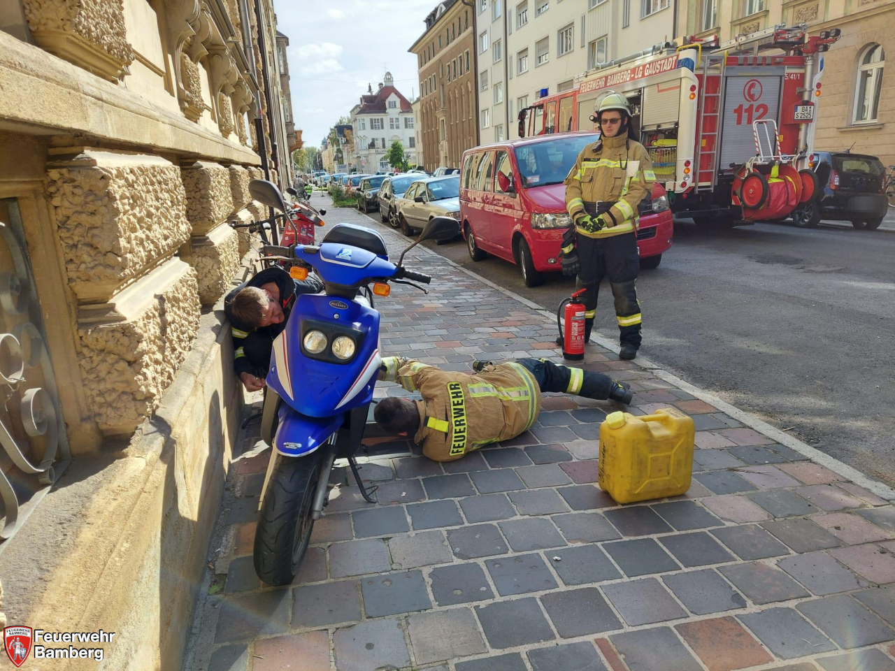 Die Feuerwehr Bamberg wurde in die Innenstadt zu einem Motorroller mit undichter Kraftstoffanlage alarmiert. Da die Ständige Wache im Einsatz gebunden war, wurde diese Aufgabe der Löschgruppe 5/6 zugeteilt, die in diesem Zeitraum die Gebietsabsicherung als Wachbesetzung übernahm.
