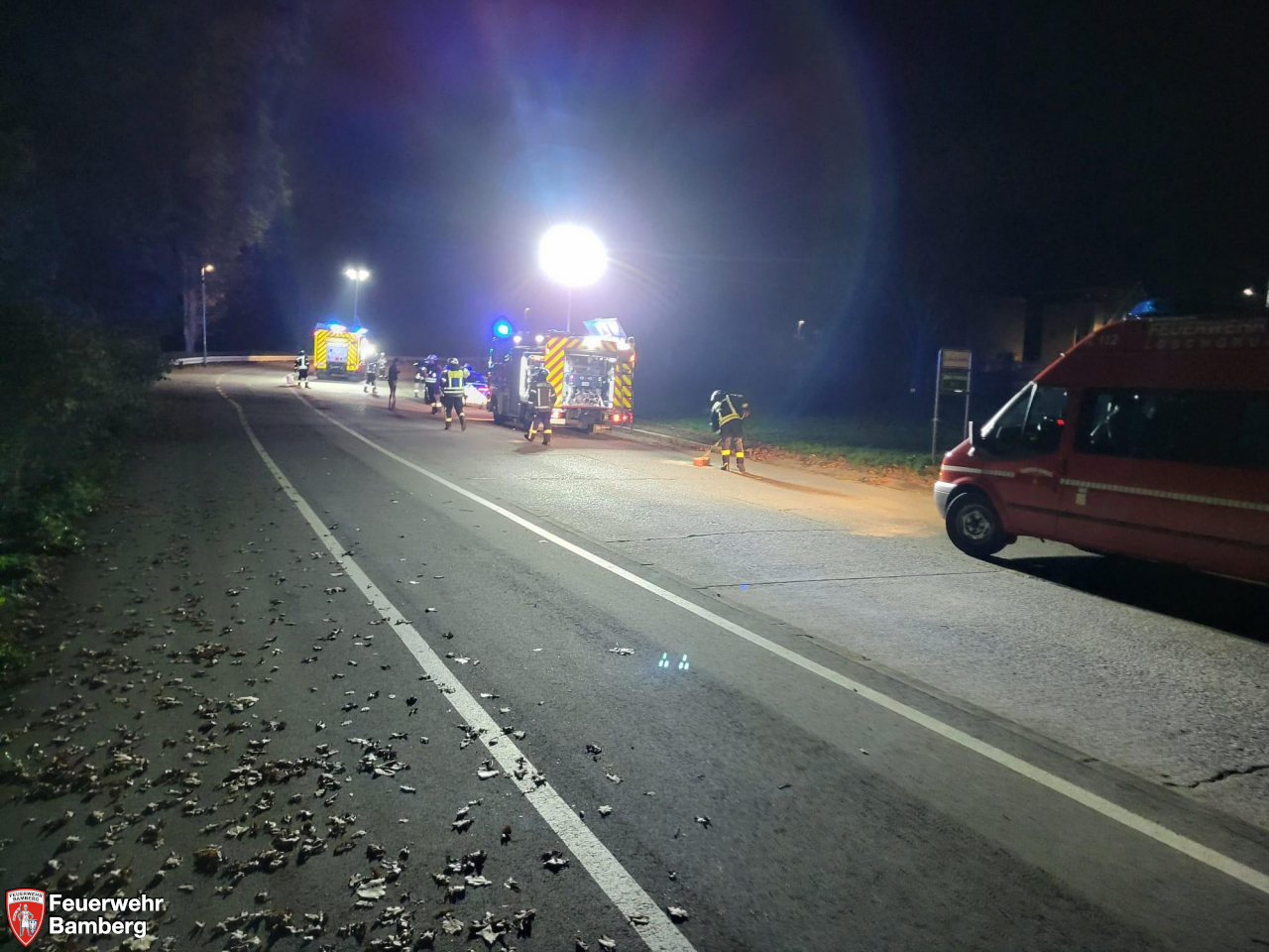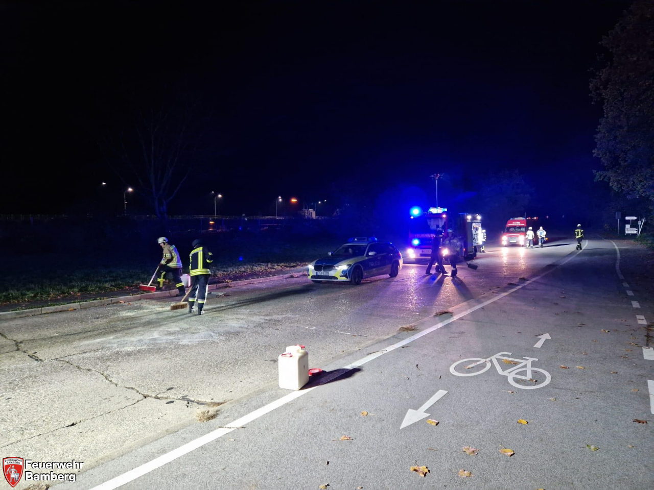 Die Feuerwehr Bamberg wurde am Abend in die Galgenfuhr in den Bereich der Schleuse alarmiert, um eine Fahrbahnreinigung vorzunehmen. Ein Fahrzeug hatte Kühlflüssigkeit verloren und auf der Fahrbahnoberfläche einen schmierigen Film hinterlassen.