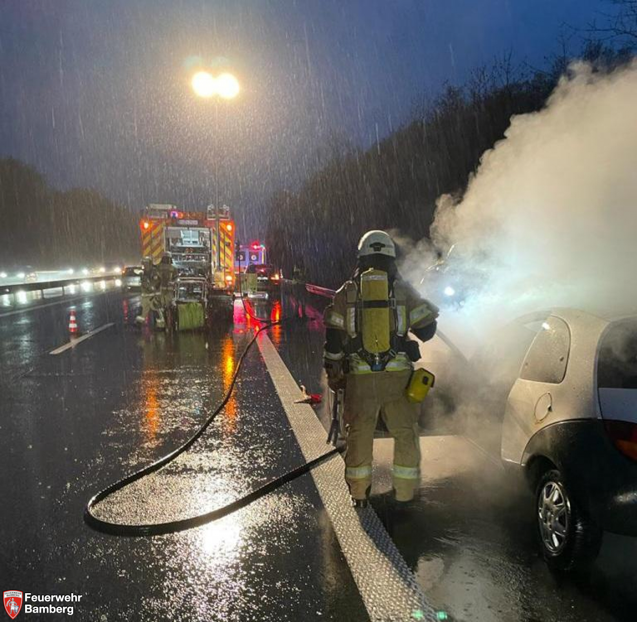 Die Feuerwehr Bamberg wurde am Nachmittag auf die A73 Richtung Nürnberg zu einem Pkw-Brand kurz vor der Anschlussstelle Hirschaid alarmiert.