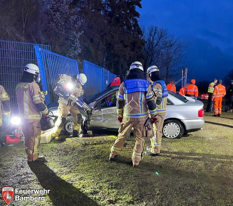 Am Morgen wurde die Feuerwehr Bamberg zusammen mit der Feuerwehr Hallstadt in die Hafenstraße Richtung B26 zu einem Verkehrsunfall mit eingeklemmter Person alarmiert. Im Kreuzungsbereich stießen ein Pkw und ein Lkw zusammen. Der/die Pkw-Fahrer*in war im Fahrzeug eingeklemmt und musste mit technischem Gerät befreit werden.