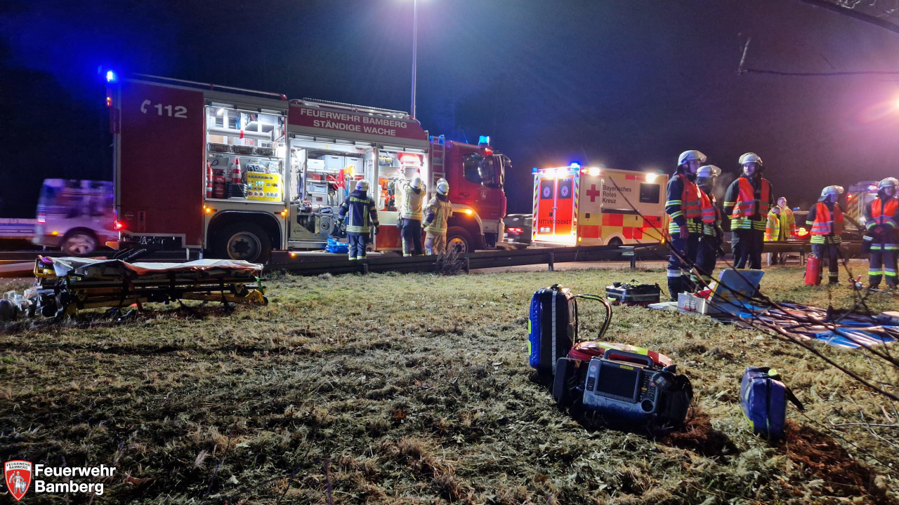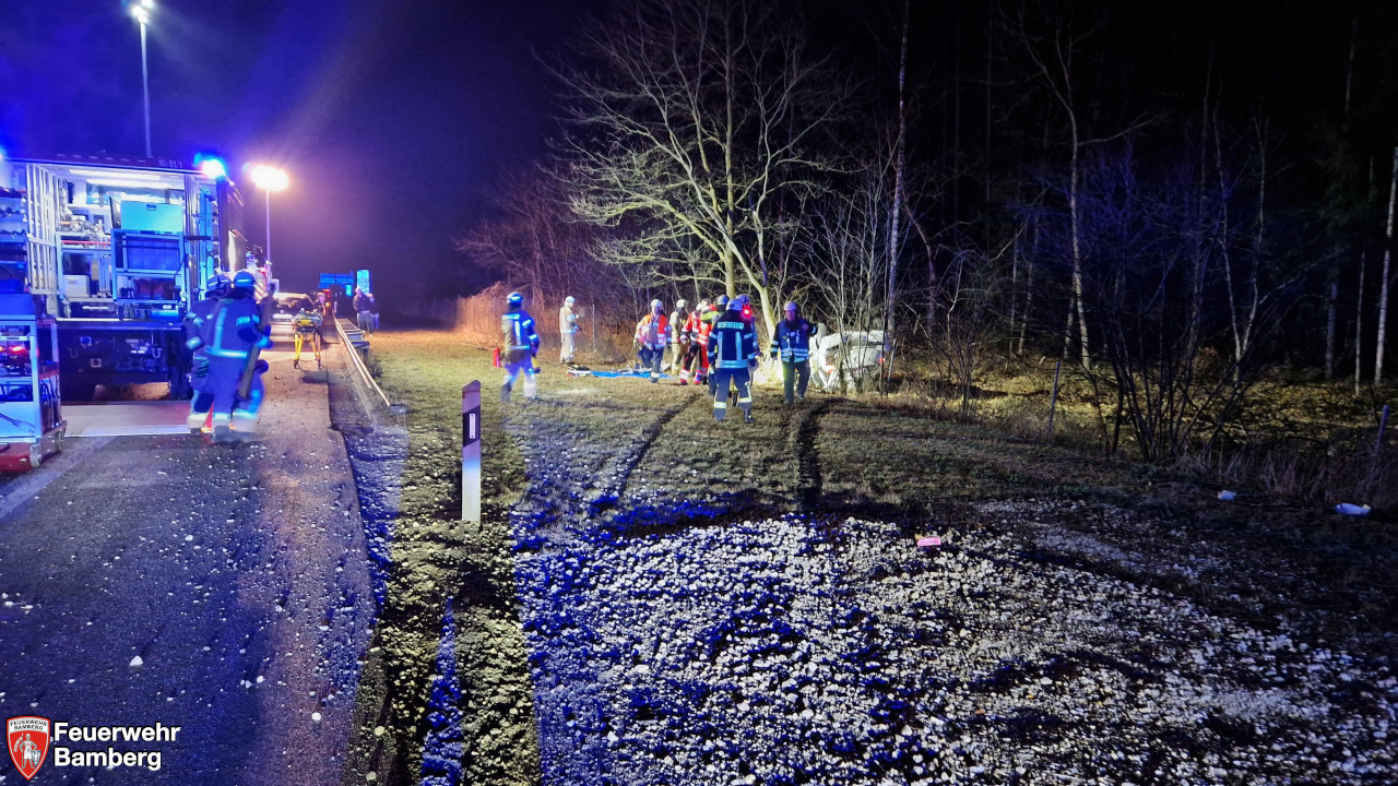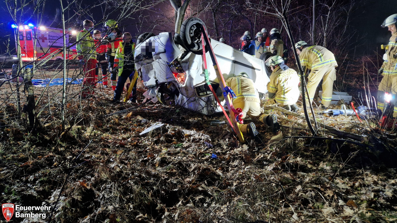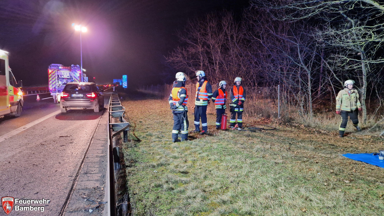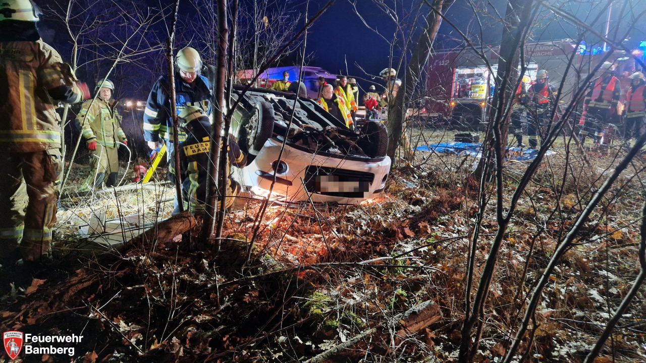 Am Abend wurde die Feuerwehr Bamberg auf die A73 Fahrtrichtung Nürnberg zwischen den Anschlussstellen Bamberg Ost und Bamberg Süd zu einem Verkehrsunfall mit eingeklemmter Person alarmiert. Ein Klein-Pkw wurde von einem anderen Fahrzeug von hinten gerammt und kam dadurch nach rechts von der Fahrbahn ab. Dabei dreht sich das Fahrzeug auf die Seite und schlug in einen Baum ein. Das Dach wurde auf der Rückbank komplett eingedrückt und die Türen verklemmt. Die Person konnte sich nicht aus dem Fahrzeug befreien.