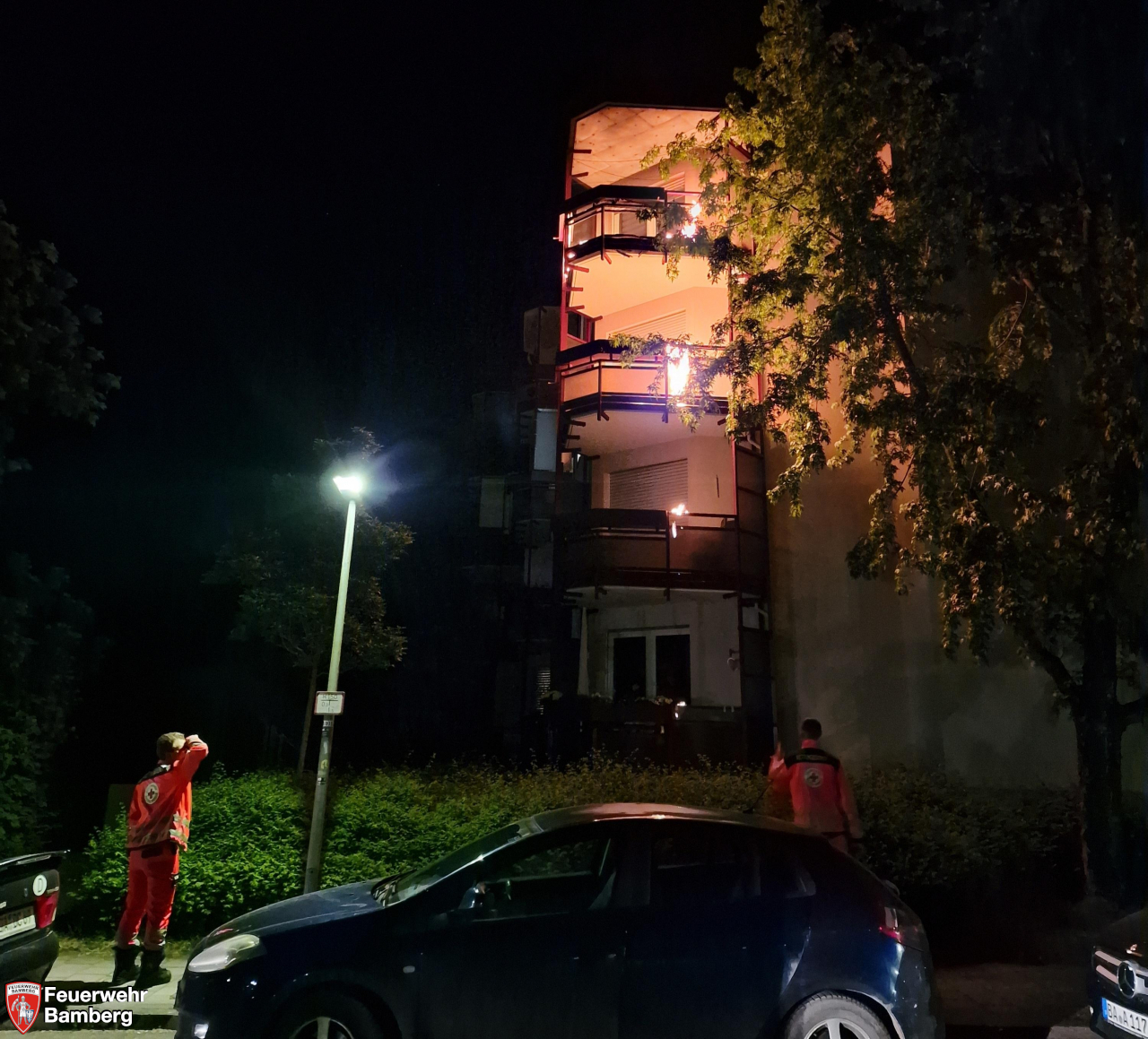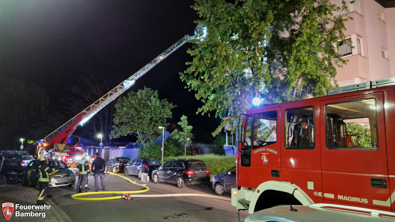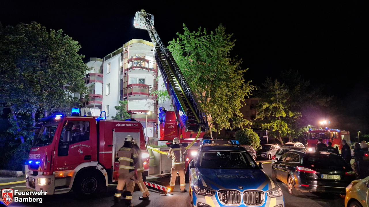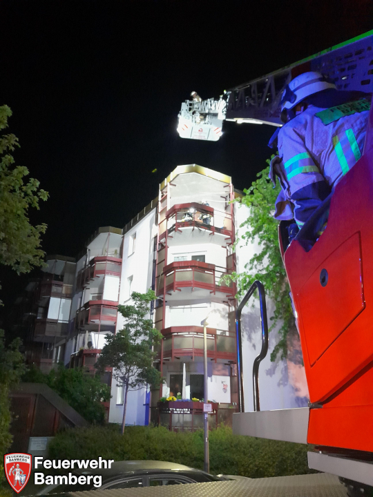 In den frühen Morgenstunden des Feiertags wurde die Feuerwehr Bamberg zu einem Balkonbrand in die Hans-Böckler-Straße alarmiert. Zuerst eintreffende Polizeistreifen meldeten eine Ausdehnung über mehrere Stockwerke und Personen in Gefahr. Auf dem Balkon im 3. Obergeschoss waren Gegenstände in Brand geraten und hatten dabei auch die Balkonverkleidung aus Kunststoff in Brand gesteckt. Diese tropfte brennend ab und entzündete auch die Verkleidungen in den Stockwerken darunter. Eine Person unternahm Löschversuche, zog sich dabei aber eine leichte Rauchvergiftung zu.