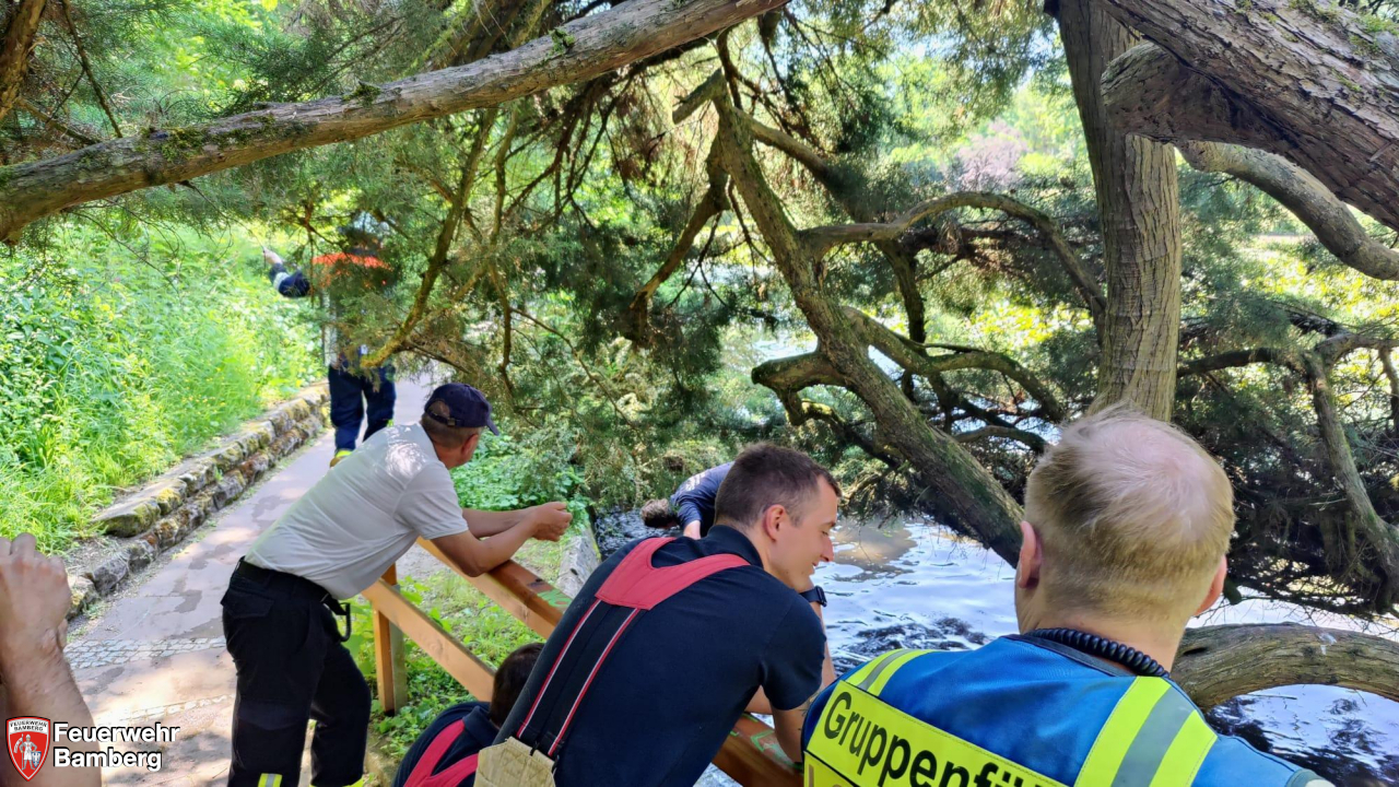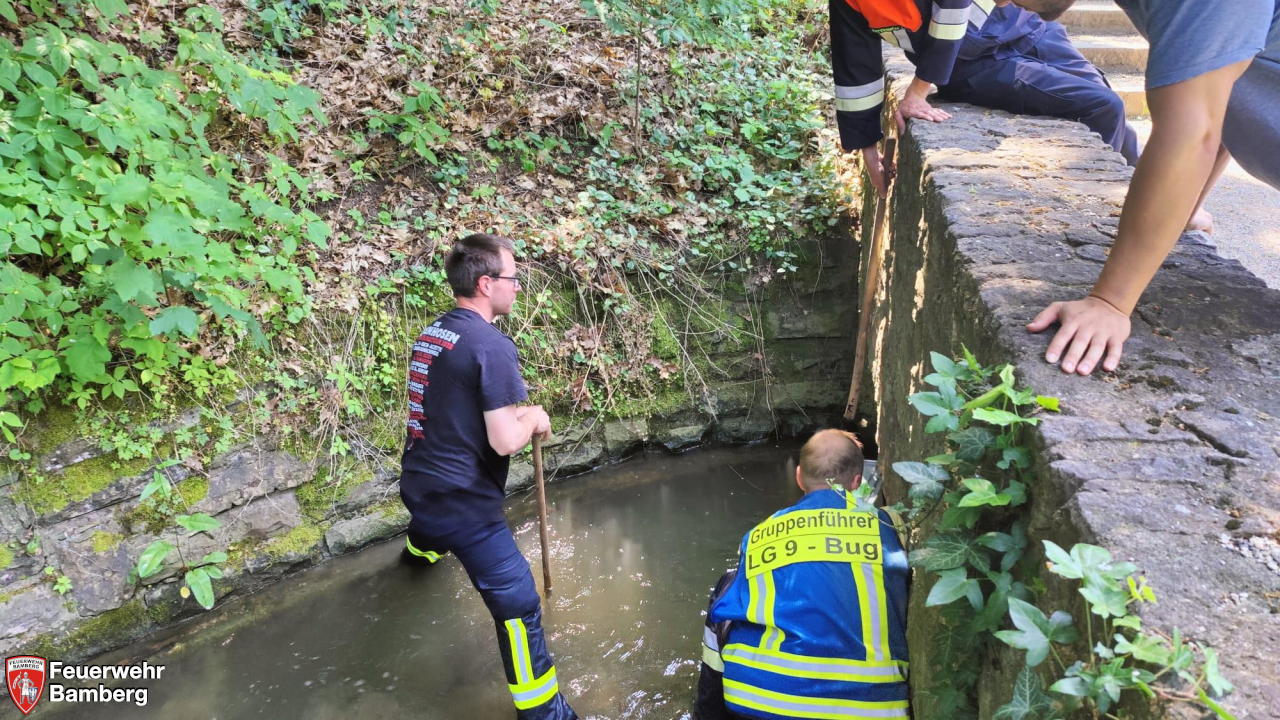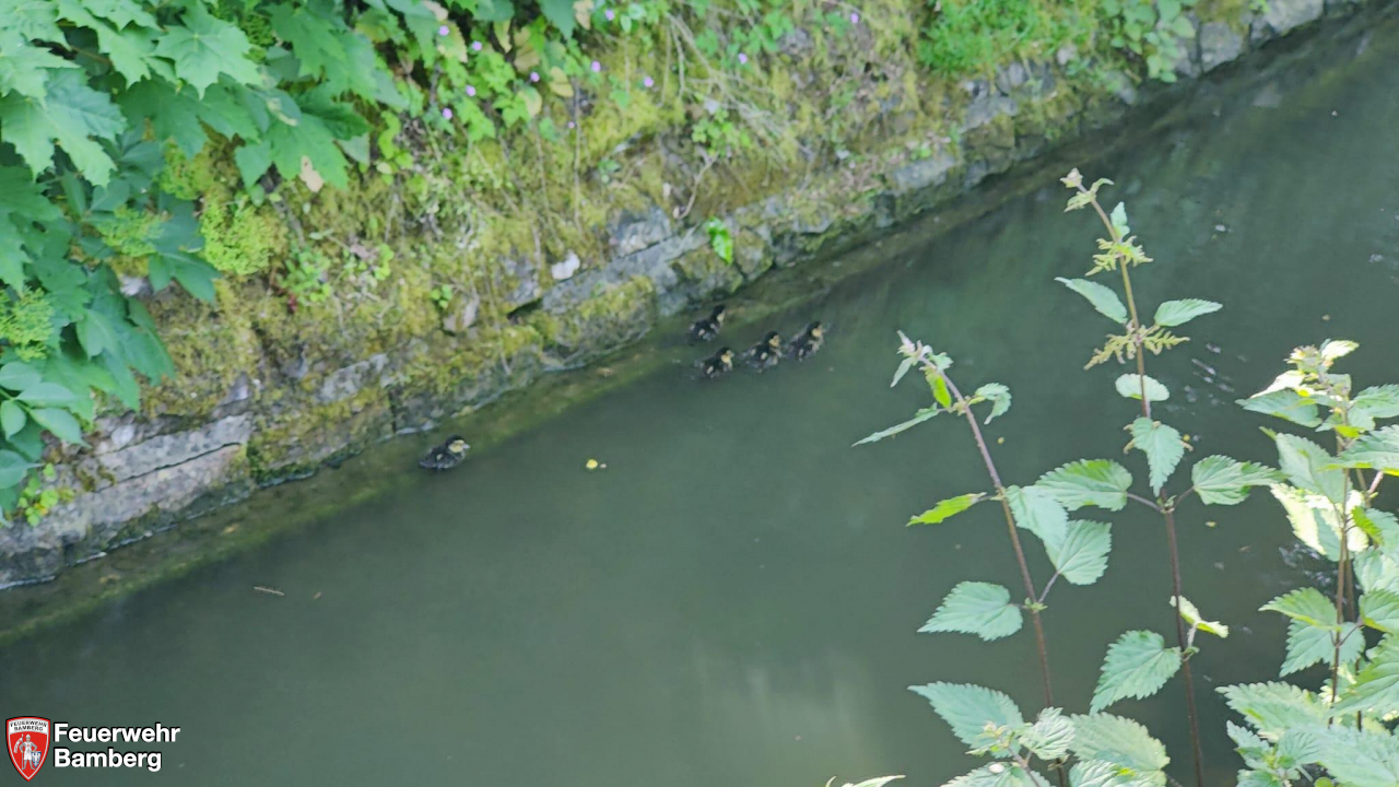 Am Pfingstmontag wurde die Feuerwehr Bamberg ins Haingebiet zur Rettung einer jungen Entenfamilie alarmiert.