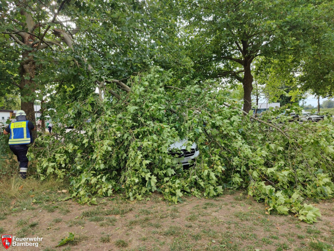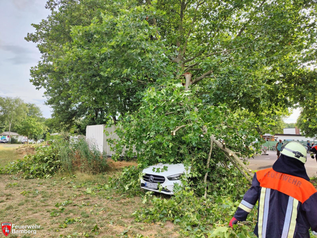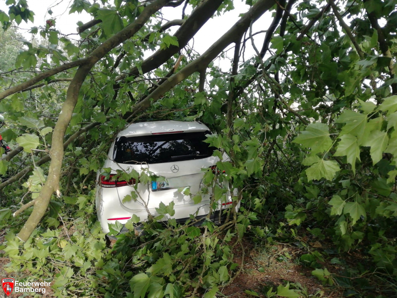 Hier wurde aufgrund der auftretenden Windböen ein sehr großer Ast abgebrochen und auf ein Auto geworfen.