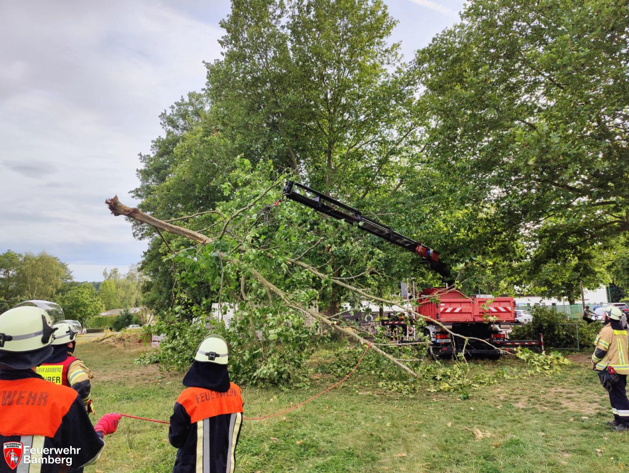 Mit Hilfe eines Lkw-Ladekrans konnte der zentnerschwere Ast gehoben und entfernt werden.