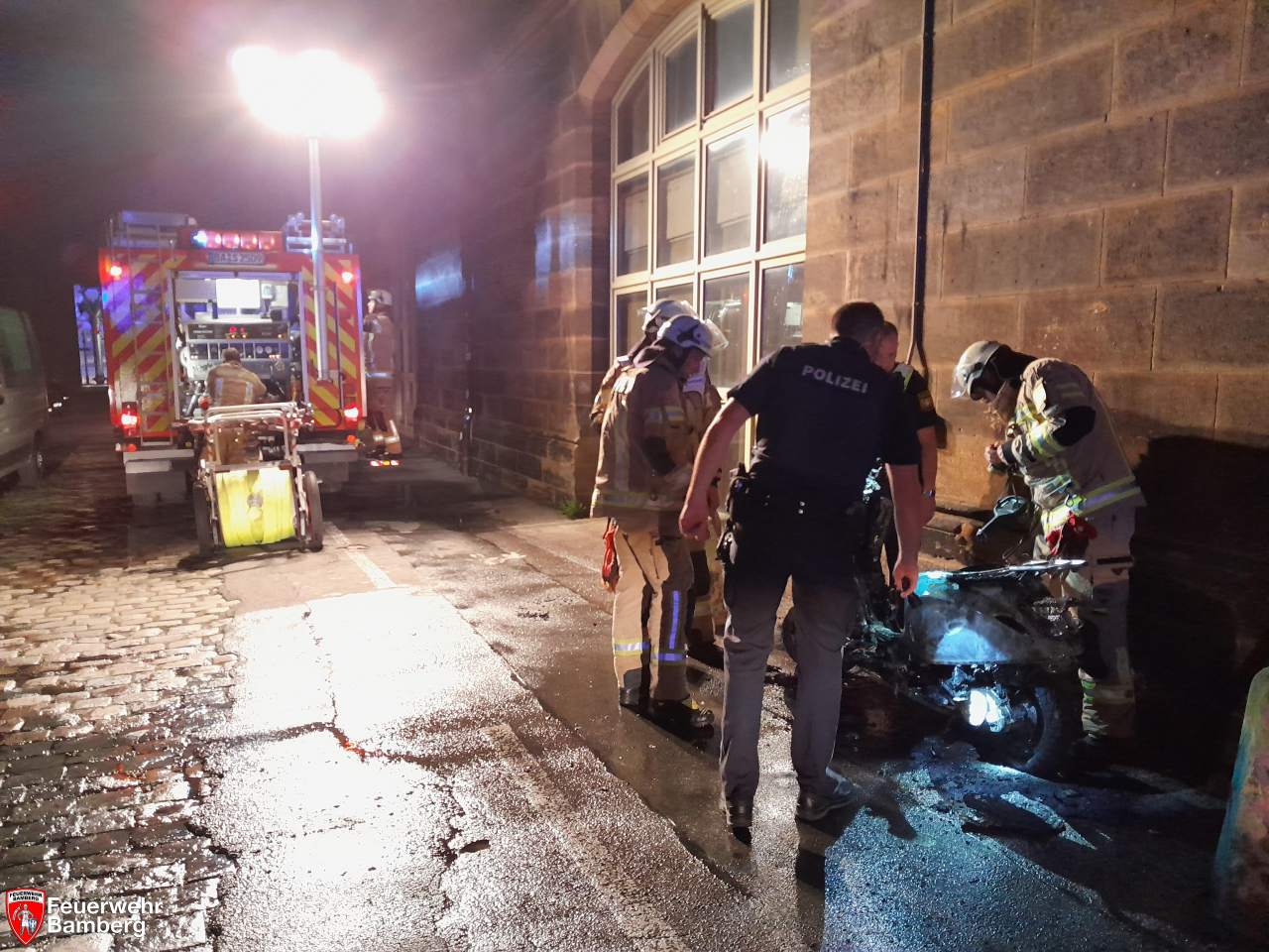Ob es hier aufgrund der zeitlichen und örtlichen Nähe einen Zusammenhang mit der vorangegangenen Einsatzstelle gibt, steht im Fokus der Ermittlungsarbeiten der Polizei. Zudem musste eine Halterfeststellung am Roller durchgeführt werden. Am Gebäude kam es ebenfalls durch Brandeinwirkung zu Abplatzungen der historischen Fassade.