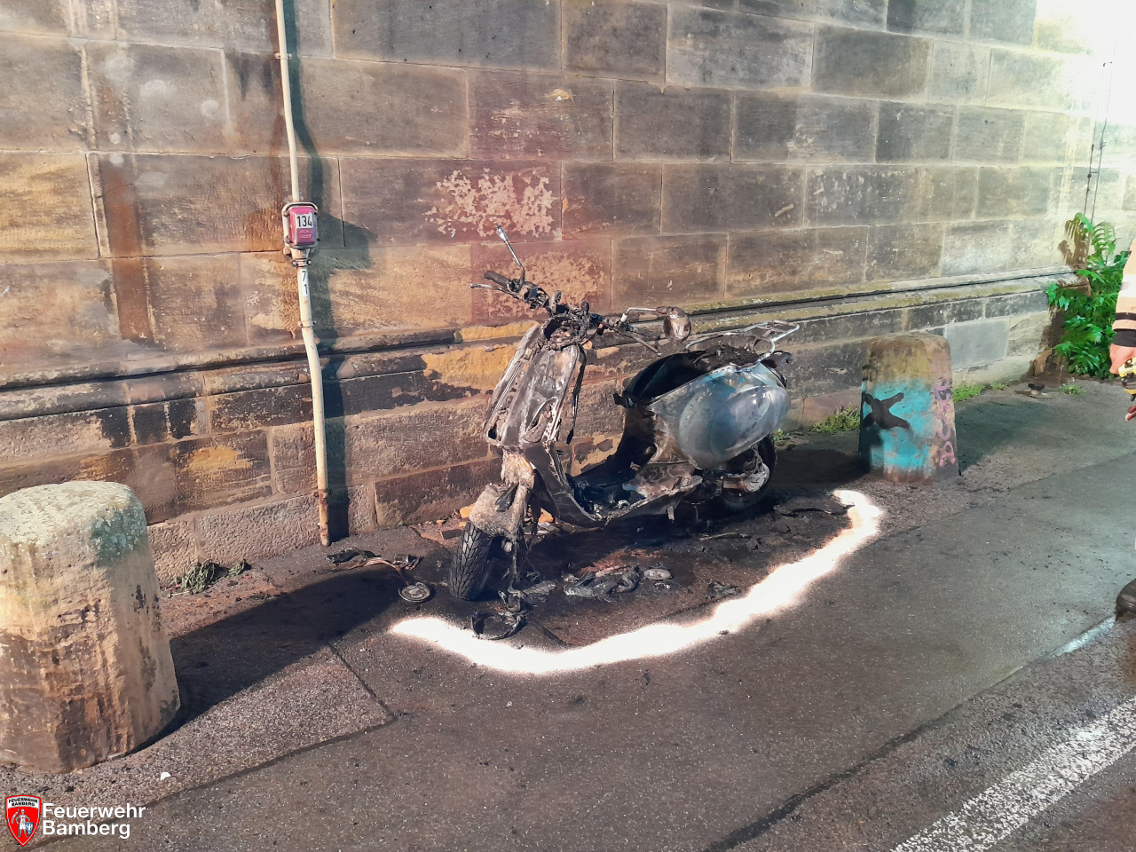 Im Anschluß an den Brandeinsatz in der Altstadt wurden die Kameraden nur wenig entfernt erneut zu einem Feuer alarmiert. "Am Kanal" stand ein Motorroller lichterloh in Flammen. Auch hier wurde mit dem Schnellangriffschlauch gelöscht. Ein Trupp unter Atemschutz dämmte die Flammen rasch ein und verhinderte so eine Ausbreitung in die Dachhaut.