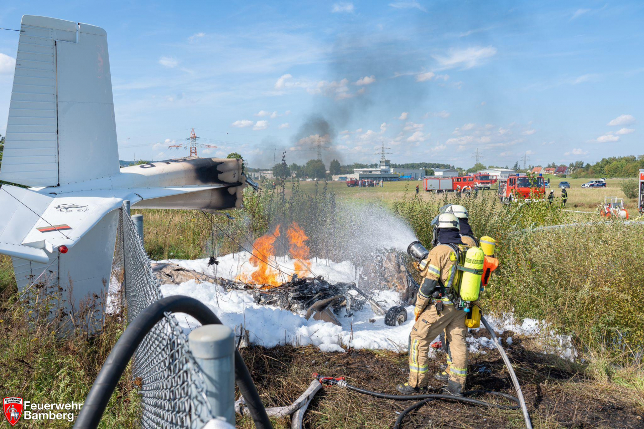 Die Feuerwehr Bamberg wurde am Sonntag Mittag zu einem brennenden Flugzeug nach Kramersfeld auf das Gelände des Aero-Clubs Bamberg alarmiert. Dieses überschlug sich nach einem missglückten Startversuch im Fangzaun und geriet in Brand. Der Pilot war noch im Flugzeug eingeschlossen und in höchster Gefahr. Bei dem Flugzeug handelte es sich um eine Cessna mit einer Person an Bord.