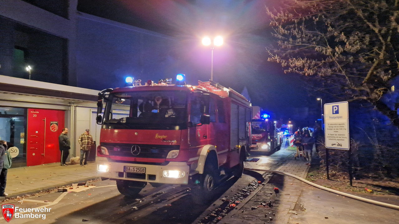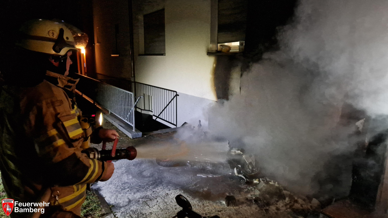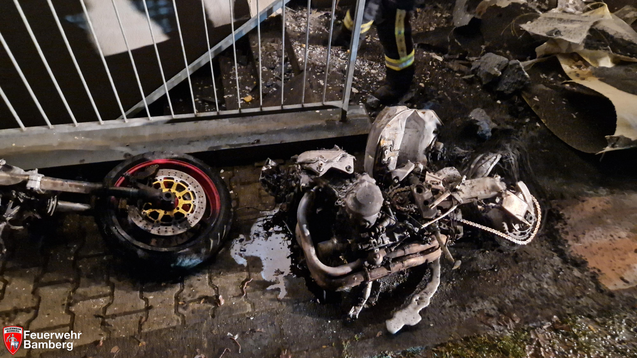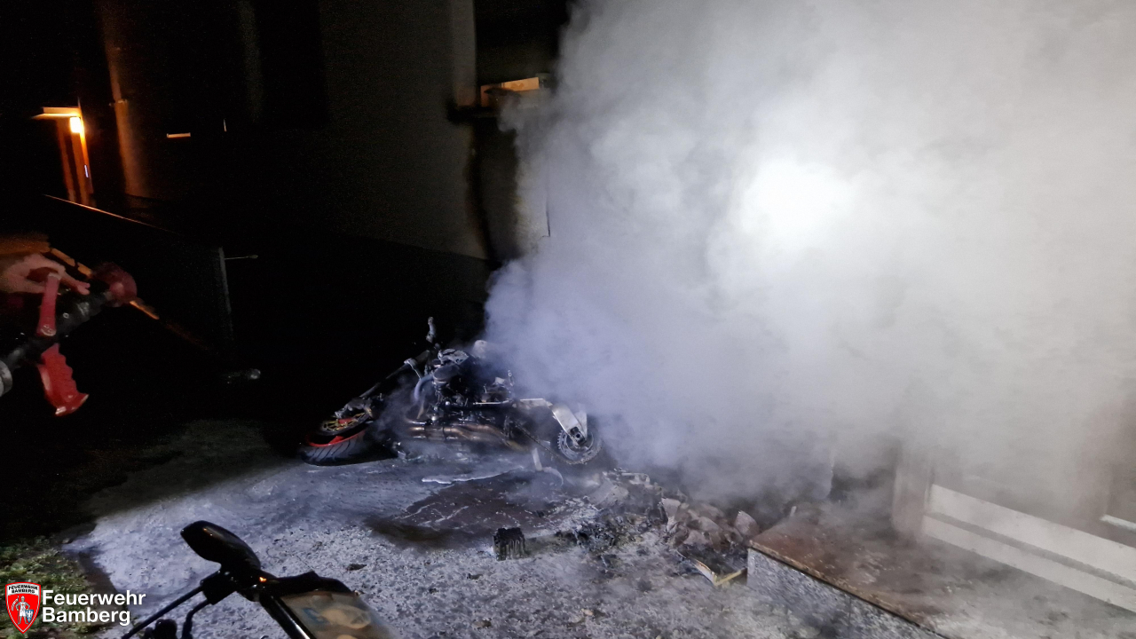 Am frühen Neujahrsmorgen wurde die Feuerwehr Bamberg in die Gereuth zum Brand eines Motorrades alarmiert. Ungünstigerweise stand dieses an einer Hausfassade, so dass diese stark in Mitleidenschaft gezogen wurde. Alle Hausbewohnerinnen und Bewohner konnten sich selbstständig und unverletzt in Sicherheit ins Freie bringen.