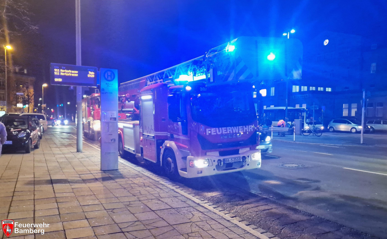 Am Abend wurde die Feuerwehr Bamberg in einen Lebensmittelmarkt in Bahnhofsnähe alarmiert. Angestellte klagten nach verdächtigen Wahrnehmungen über Atemwegsbeschwerden. Das Geschäft wurde geräumt und alle Kunden und Angstellten fanden sich im Freien ein.