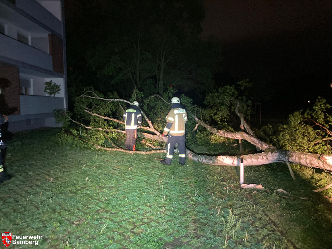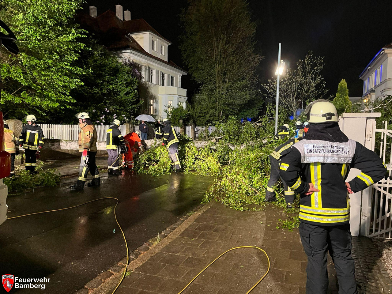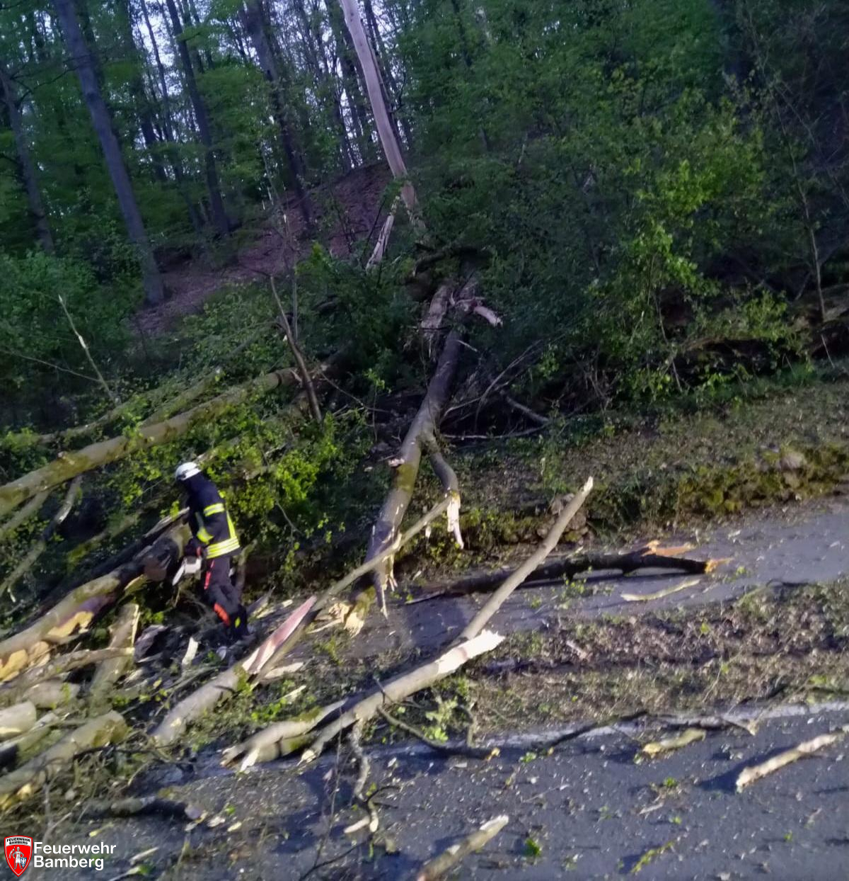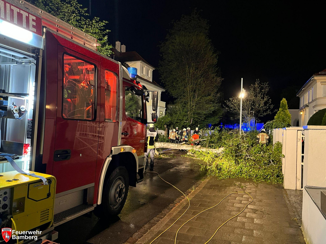 In der Nacht zum Dienstag kam es aufgrund der starken Windböen ab 20 Uhr zu mehreren Einsätzen im und rund ums Stadtgebiet. Die Feuerwehr Bamberg beseitigte mehrere Bäume und starke Äste zum Beispiel in der Kantstraße, wo eine Feuerwehrzufahrt blockiert war, in der Brennerstraße, wo ein Gehweg nicht mehr passierbar war, und in der E.T.A.-Hoffmann-Straße, wo ein Baum quer über der Fahrbahn lag.