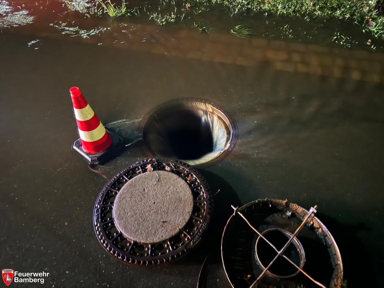 Ein Einsatzschwerpunkt war die Geisfelder Straße. Hier war die Kanalisation den Wassermassen einfach nicht mehr gewachsen und so waren hier gleich mehrere Einsatzstellen abzuarbeiten.