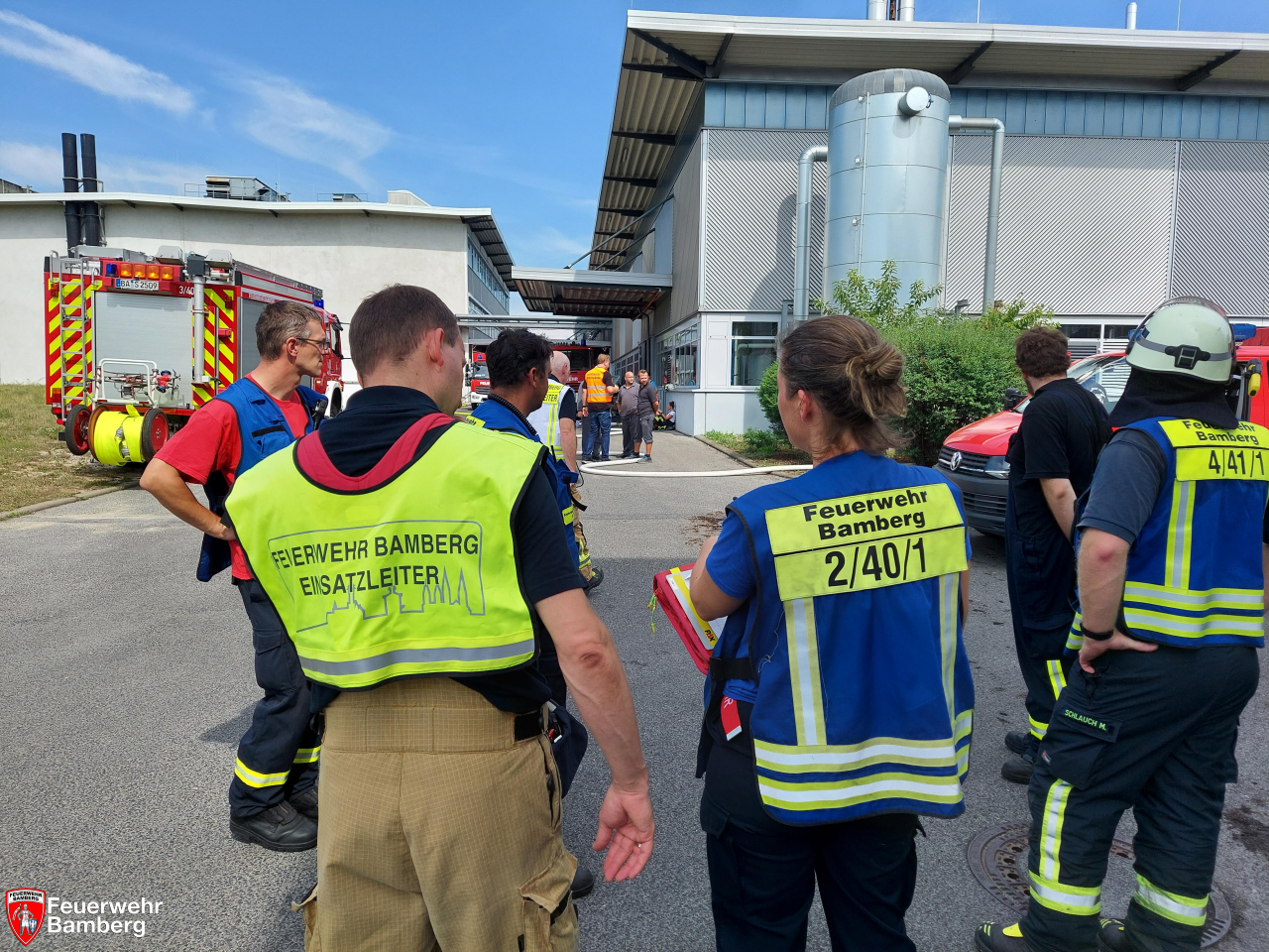 Am Nachmittag wurde die Feuerwehr Bamberg zunächst zu einer ausgelösten Brandmeldeanlage in einem Gewerbebetrieb in die Rodezstraße alarmiert. An der Einsatzstelle wurde die Einsatzleitung durch die betriebseigenen Brandschutzbeauftragten im Empfang genommen und äußerten, dass ein Säureaustritt vorliegt, da die Gefahrgutanlage deutlich erhöhte Werte anzeigt.