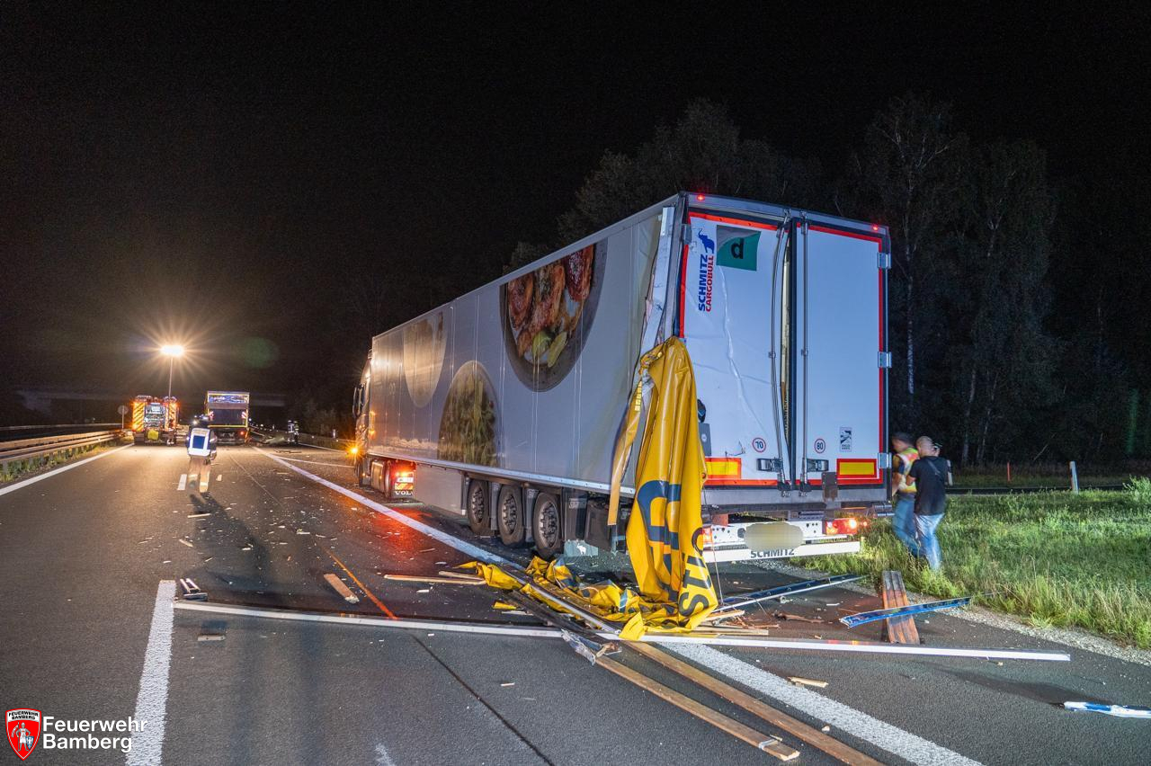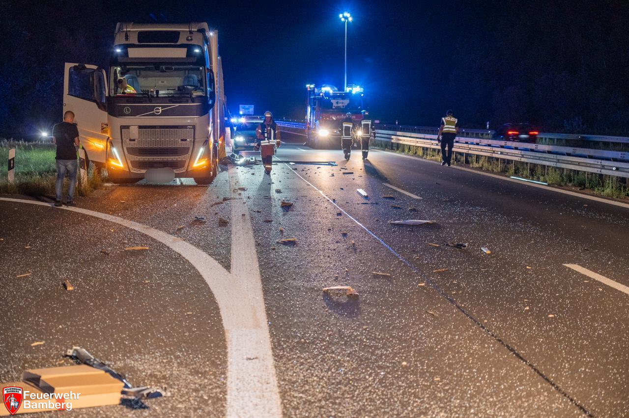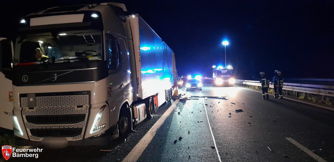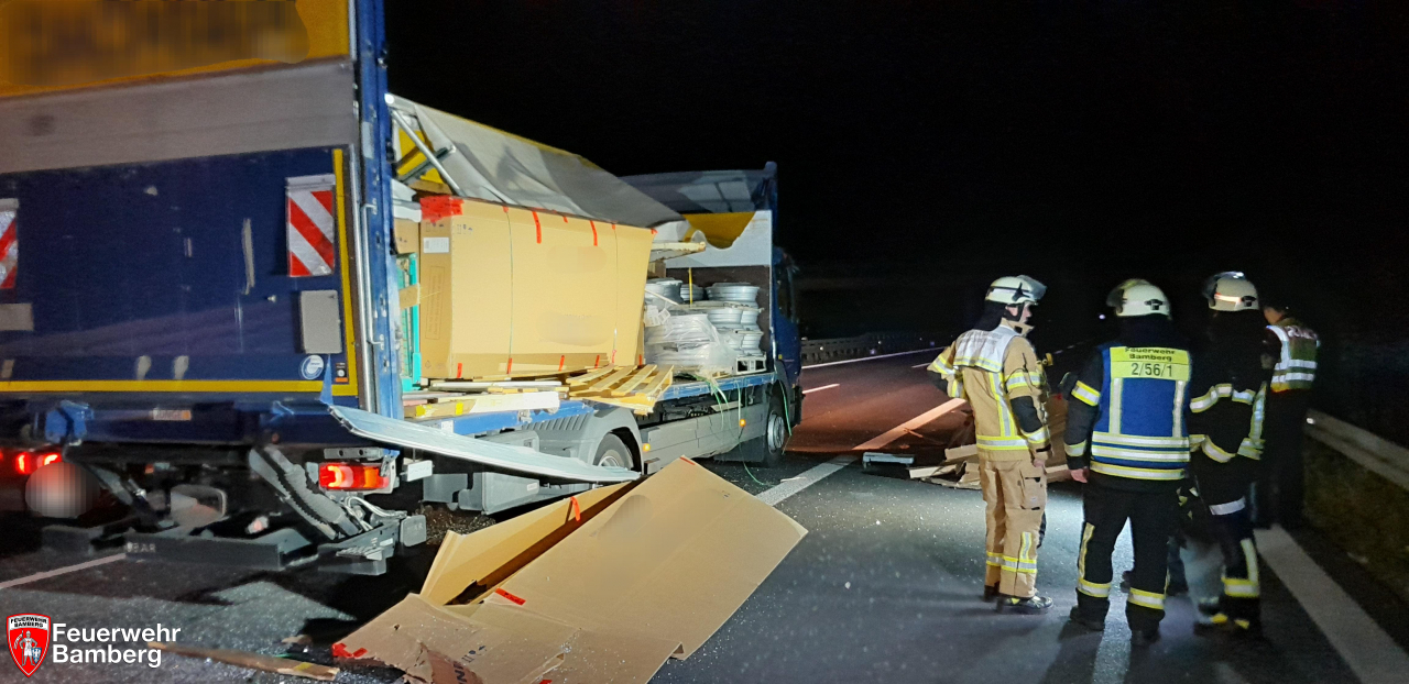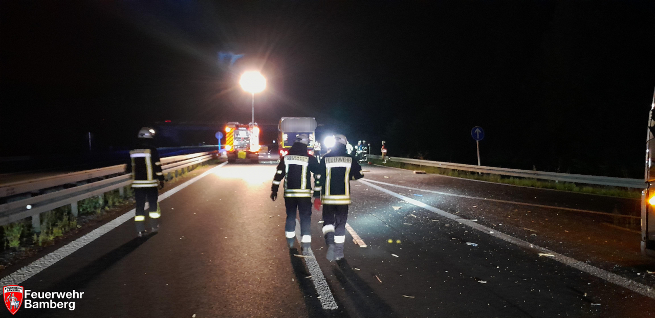 In der Nacht wurde die Feuerwehr Bamberg auf die A73 zur Ausleuchtung einer Unfallstelle alarmiert. Ein Lkw hatte auf dem Pannenstreifen angehalten und verbrachte dort seine Lenkzeitpause. Ein weiterer Lkw passierte diesen Lastwagen, wobei es zum Streifvorgang kam. Beim fahrenden Lkw wurde die komplette rechte Seite der Ladefläche abgerissen und ein Teil der Ladung fiel heraus. Diese verteilte sich auf etwa 50 Meter Länge über die komplette Fahrbahn, was eine Vollsperrung in Fahrtrichtung Süden notwendig machte. Durch die Polizei wurde eine Ausleitung des Verkehrs an der Ausfahrt Bamberg Ost durchgeführt.