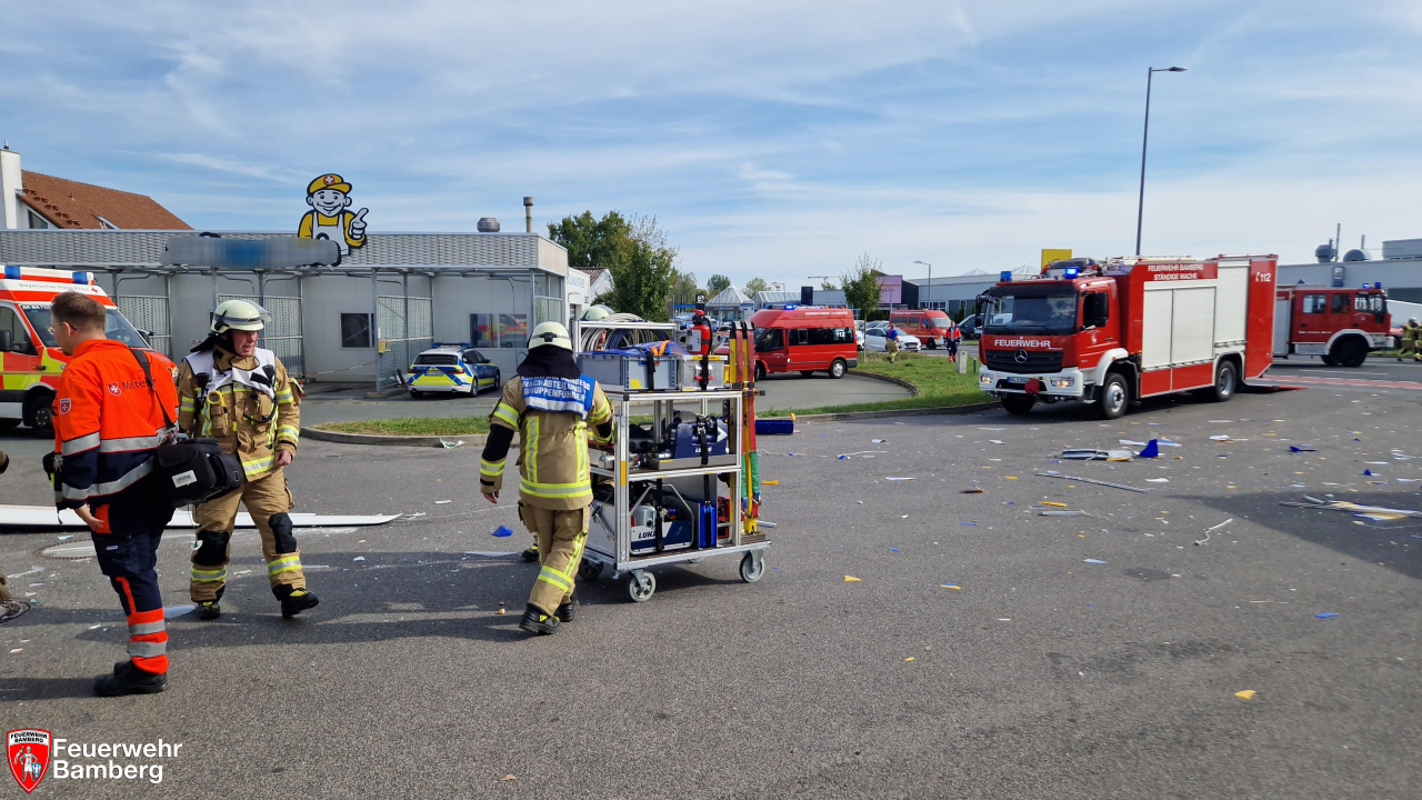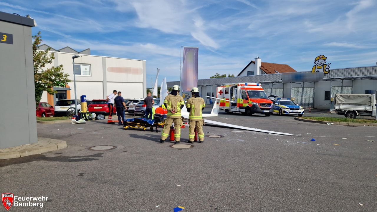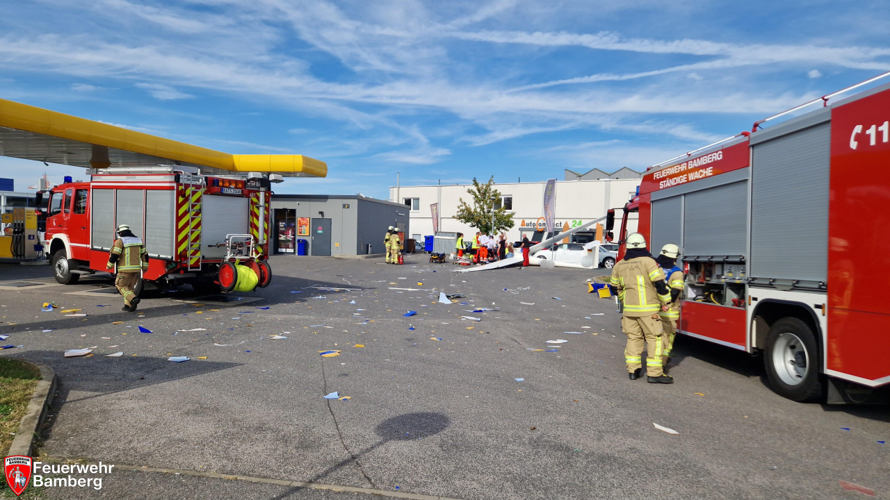 Am Sonntag Nachmittag wurde die Feuerwehr Bamberg an den Berliner Ring zu einem abgestürzten Segelflieger alarmiert. Anwesende Kunden und Passanten meldeten, dass ein Segelflugzeug im Landeanflug mit der Tragfläche an der Preisanzeigetafel hängenblieb und anschließend hart auf dem Vorplatz der dortigen Tankstelle aufschlug. Der Pilot wurde hierbei möglicherweise schwer verletzt. Wie durch ein Wunder wurden keine weiteren Personen verletzt.