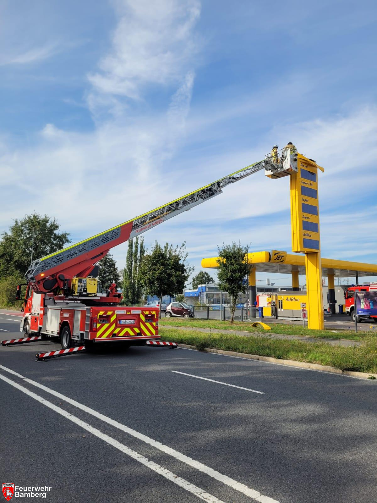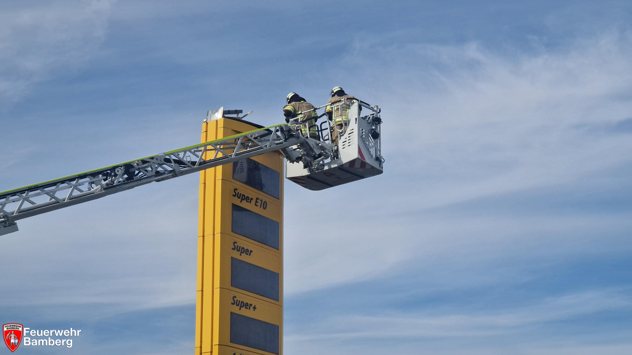 Die beschädigte Preisanzeigetafel wurde auf ihre Standsicherheit kontrolliert und lose, absturzgefährdete Teile vom Rettungskorb aus entfernt.