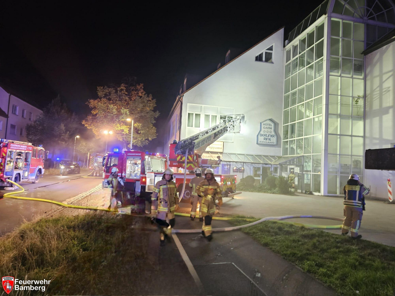 Am Freitagabend kam es in der Küche eines Hotels am Berliner Ring zu einem Brand. Infolgedessen konnte sich der Rauch aus bisher nicht geklärten Umständen im gesamten Bauabschnitt ausbreiten. Die Bamberger Feuerwehr wurde direkt in der Anfangsphase mit zwei Löschzügen zur Einsatzstelle alarmiert. Im weiteren Verlauf musste ein hoher Bedarf an Atemschutzgeräteträgern gedeckt werden. Deshalb waren bis auf die Löschgruppen Gaustadt-Michaelsberg und Wildensorg alle Einheiten mit insgesamt 90 Einsatzkräften vor Ort.