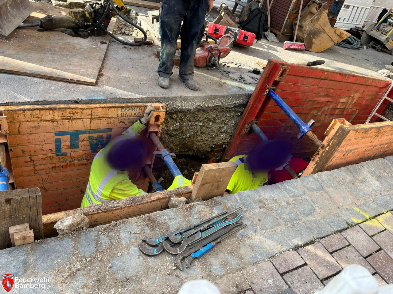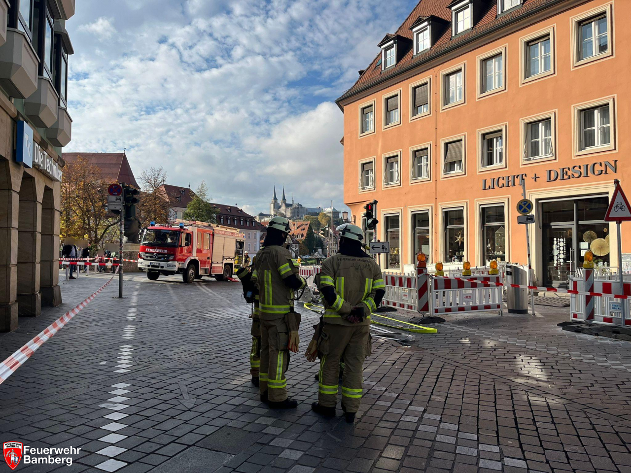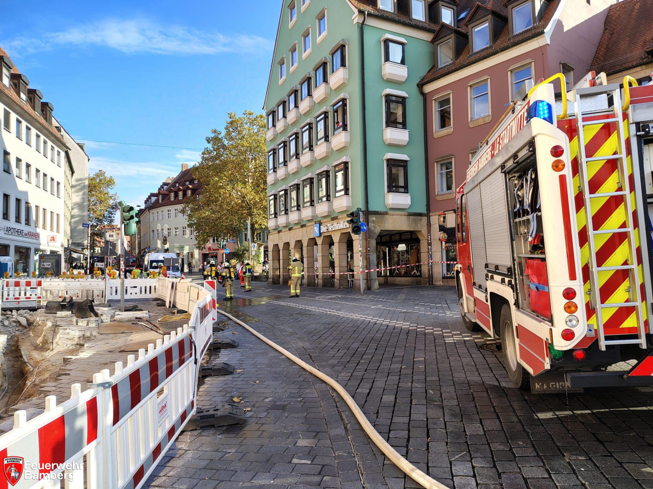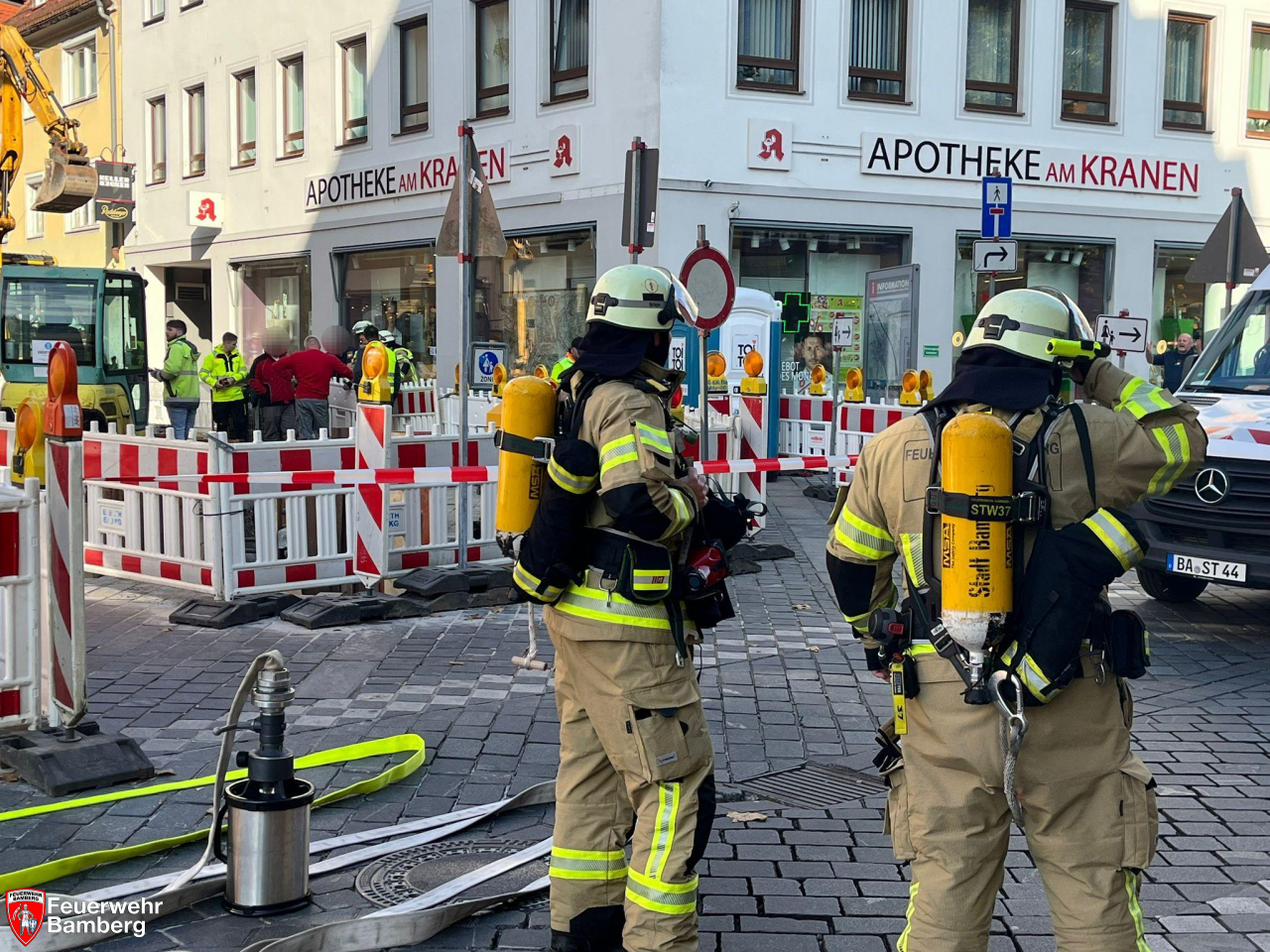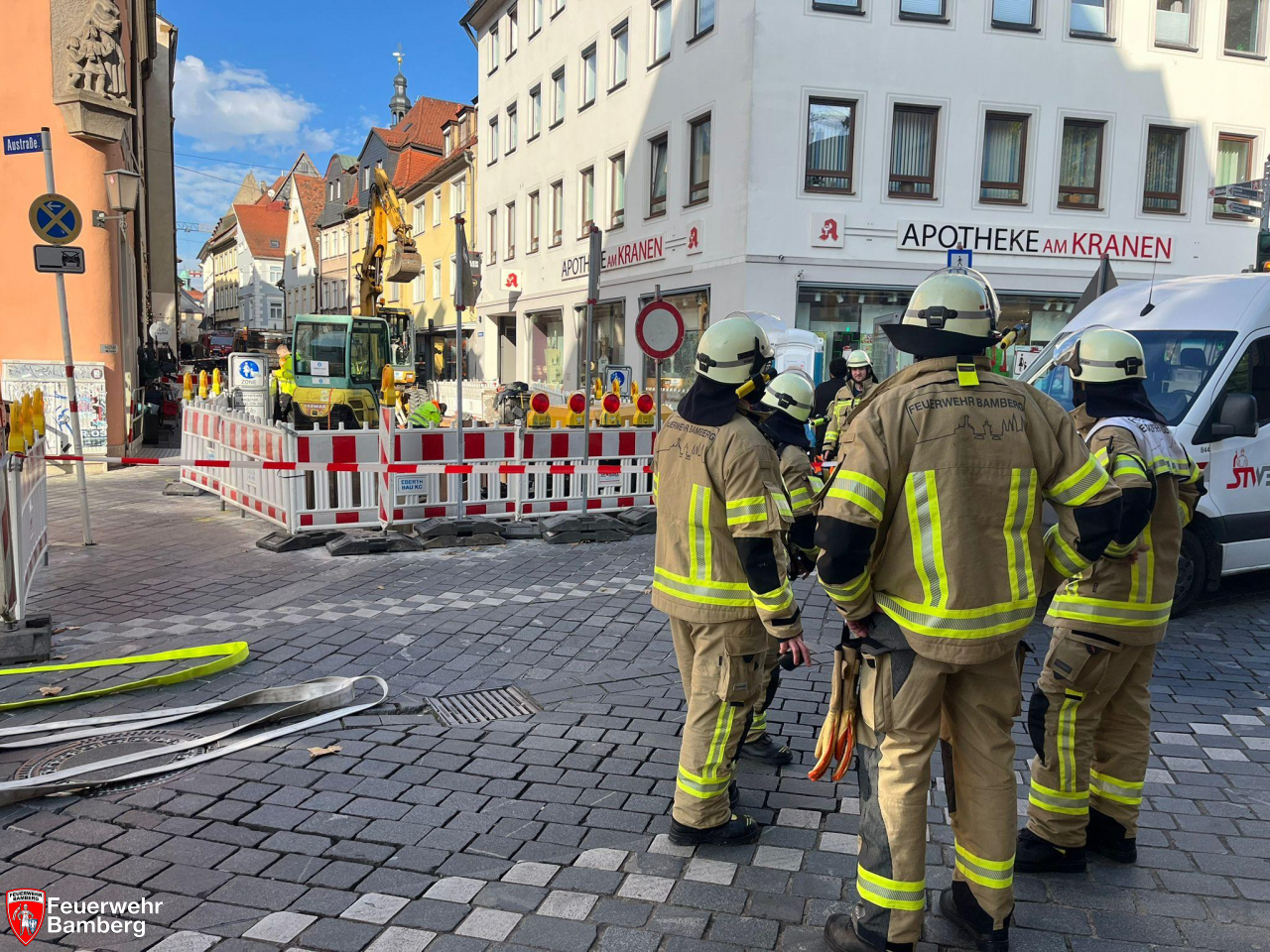 Zur Mittagszeit kam es in der Innenstadt auf einer Baustelle in der Langen Straße zu einem Gasaustritt. Ein Bagger hatte mit seinem Löffel bei Arbeiten eine städtische Gasleitung beschädigt. Daraufhin wurde die Feuerwehr Bamberg mit zwei Einheiten zur Absicherung der Einsatzstelle alarmiert.
