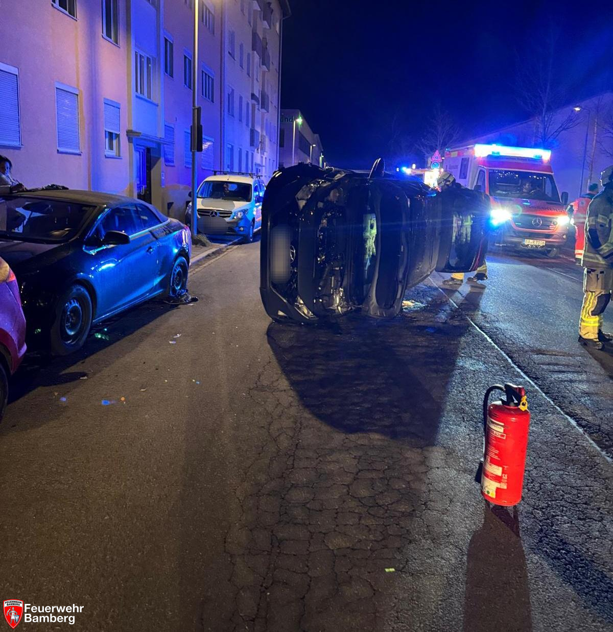 Am Abend des 1. Weihnachtsfeiertages wurde die Feuerwehr Bamberg zu einem Verkehrsunfall in die Brennerstraße alarmiert. Auf Höhe des Fahrradparkhauses touchierte ein Pkw ein geparktes Fahrzeug und wurde dadurch auf die Seite geschleudert. Zwei der drei Insassen konnten sich zunächst nicht befreien.