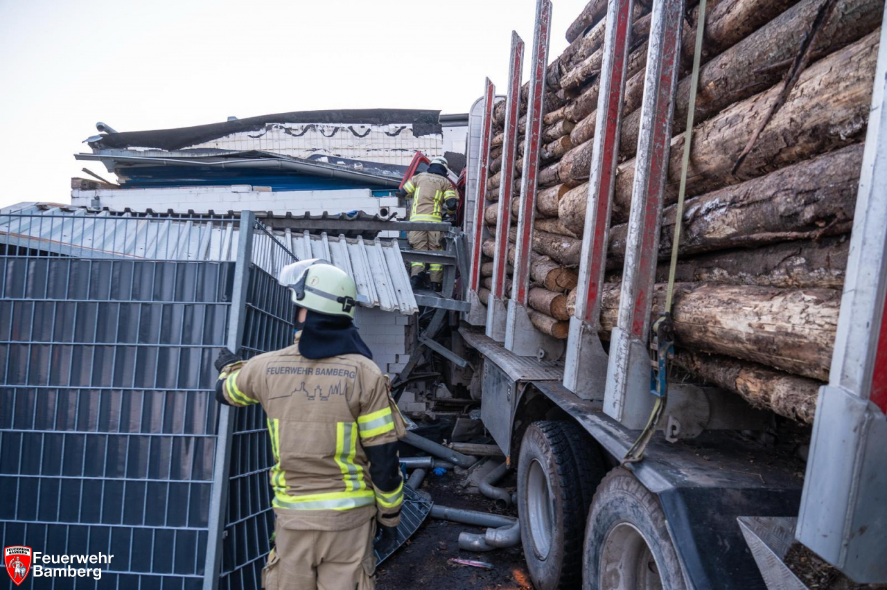 Es bestätigte sich, dass ein LKW, beladen mit etwa 25 Tonnen Holz unkontrolliert in eine Hauswand eines Industriegebäudes gefahren ist.