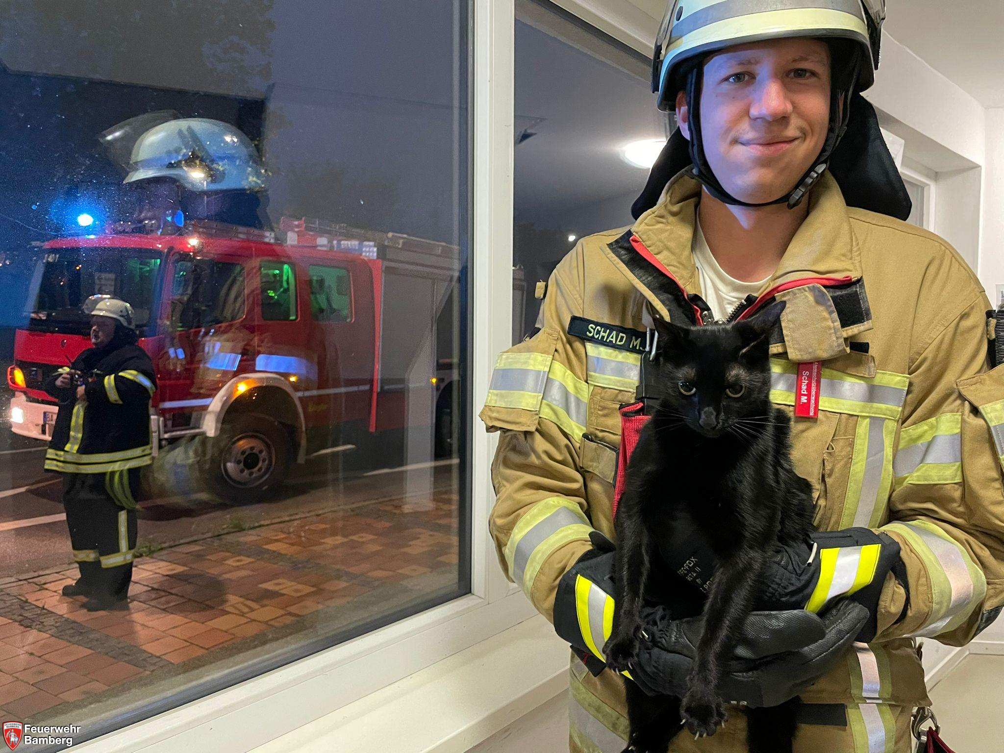 Nahezu zeitgleich zum vorhergehenden Einsatz wurde nochmals Alarm für die Feuerwehr Bamberg ausgelöst. Am Margaretendamm war eine Katze in einem gekippten Fenster eingeklemmt und konnte sich selbst nicht befreien.