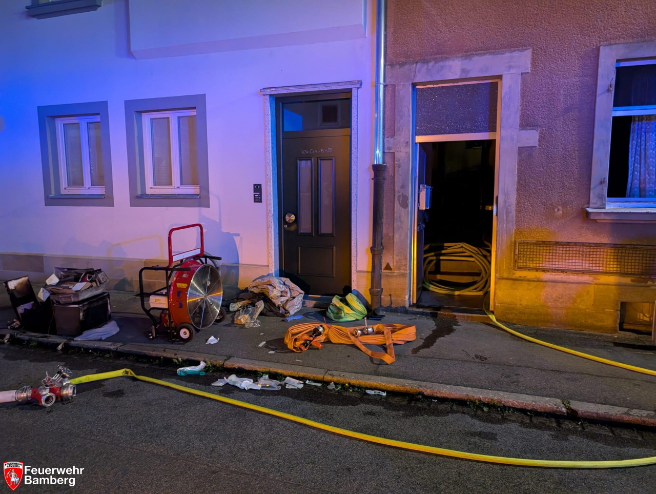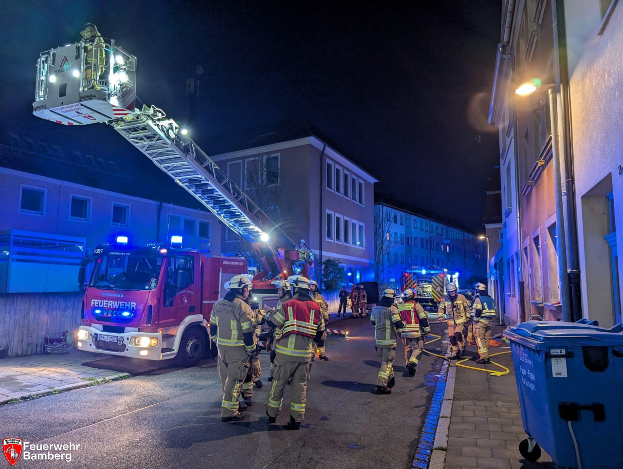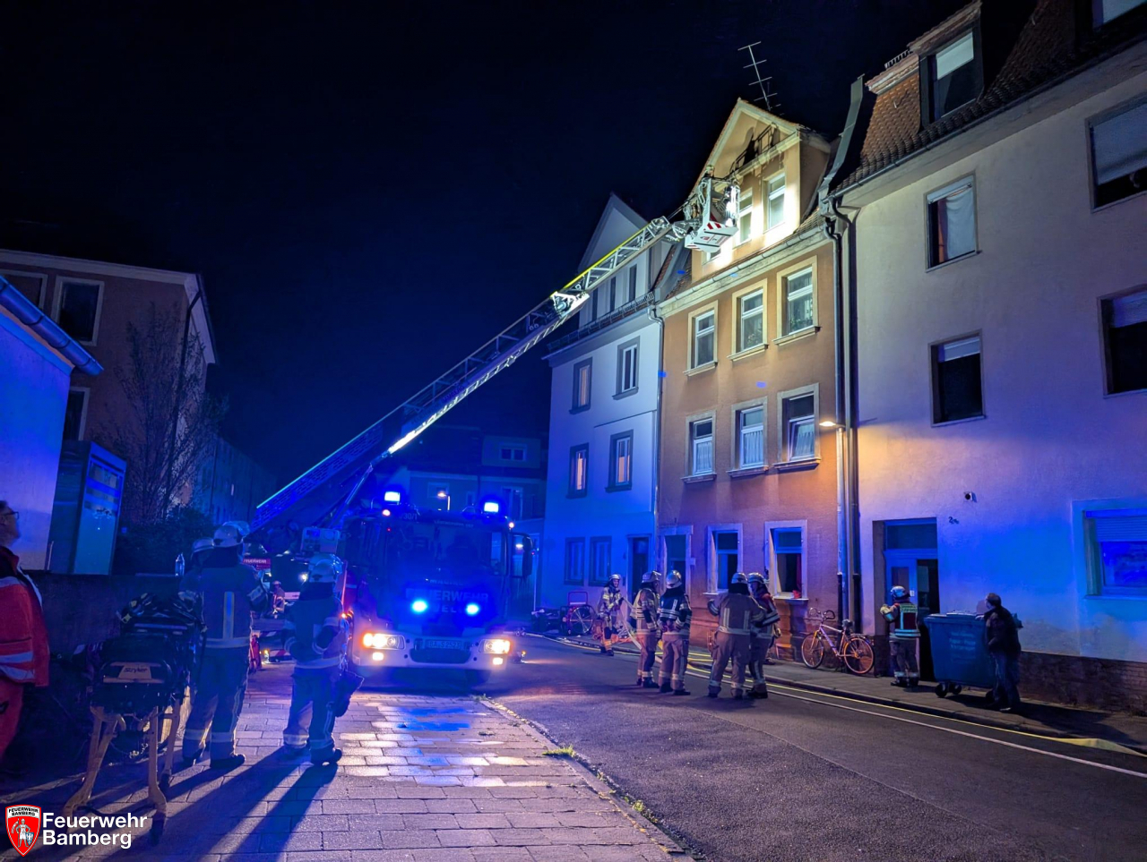Nach einem sportlich anspruchsvollen Tag wurde die Feuerwehr Bamberg am Abend noch zu einem Zimmerbrand in die Wunderburg alarmiert. Bei Eintreffen an der Einsatzstelle lag eine Person ohne erkennbare Lebenszeichen vor dem Gebäude, aus der Brandwohnung im Erdgeschoss drang starker, schwarzer Rauch. Im 2. Obergeschoss war eine Person vom Rauch eingeschlossen und stand am Fenster.