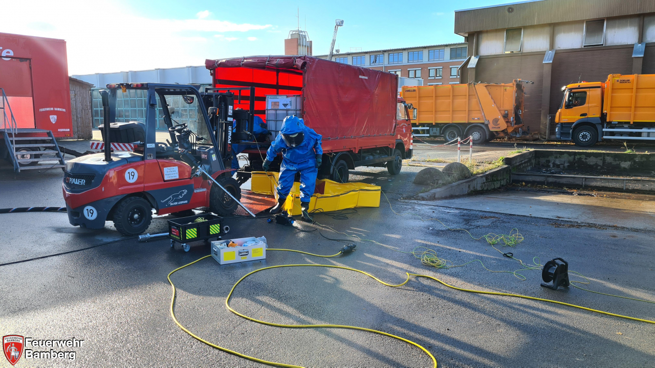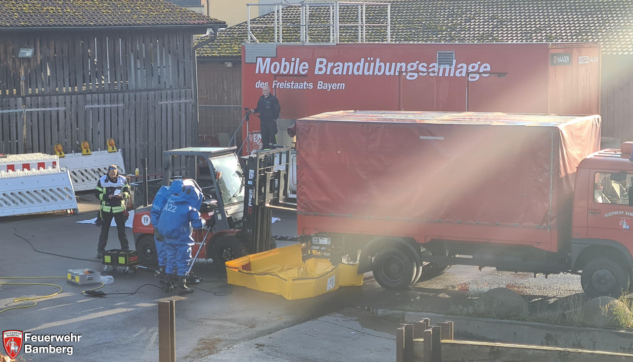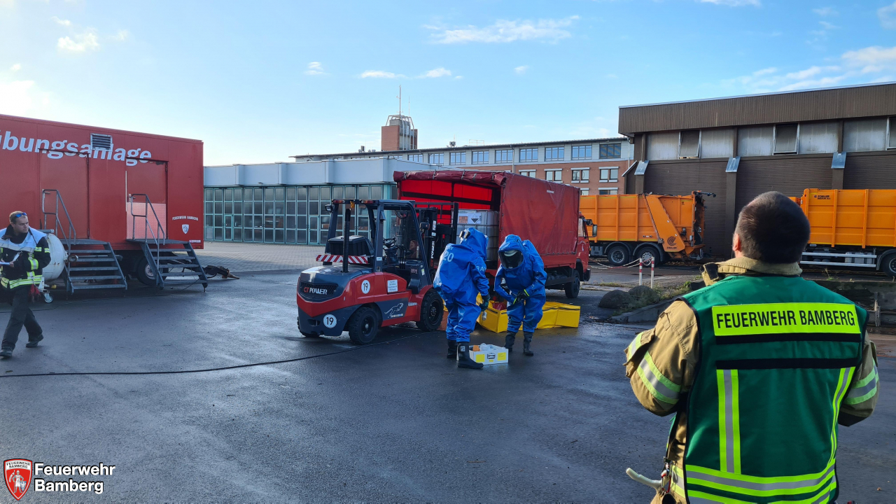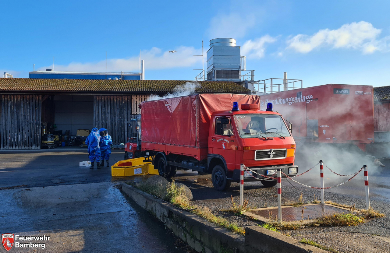 Im Rahmen der heutigen Einsatzübung auf dem Gelände der Bamberger Service Betriebe und der Ständigen Wache wurde geprobt, ob die einzelnen Stationen, die im Zuge der Neuanschaffung des Gerätewagen Gefahrgut (GW-G) im Einzelnen beübt wurden, in einem realistisch dargestellten Szenario auch miteinander harmonieren und Hand in Hand laufen.