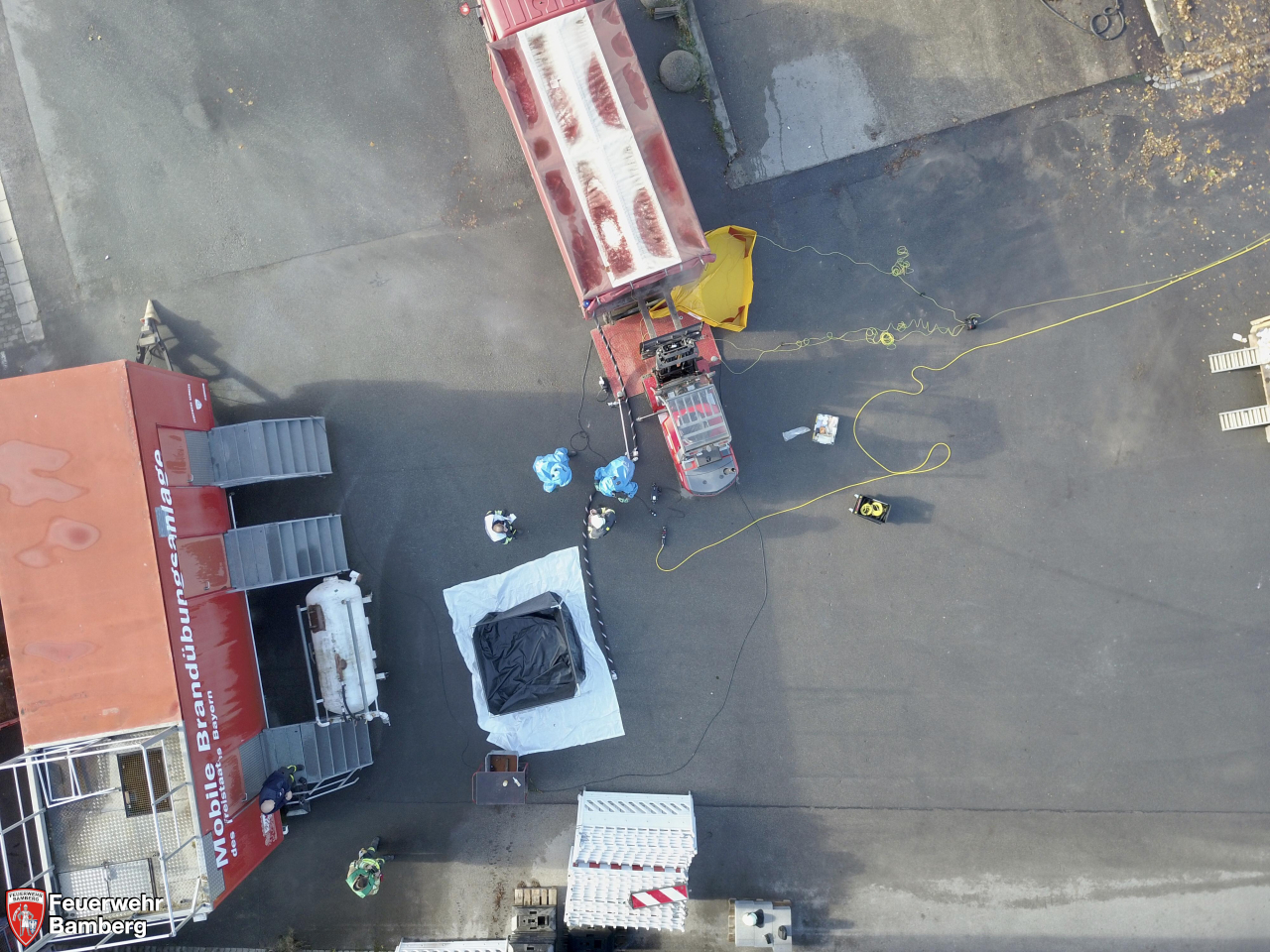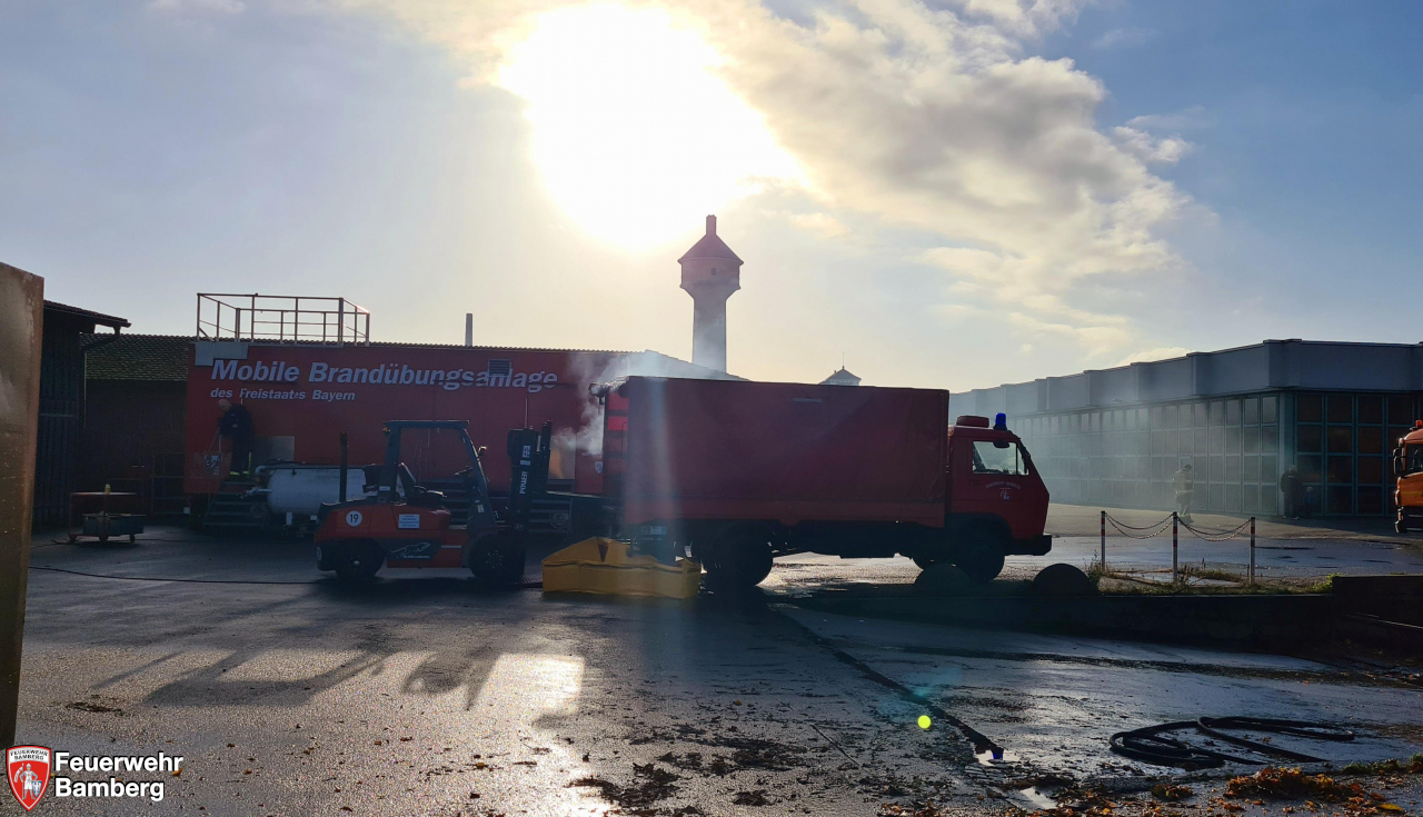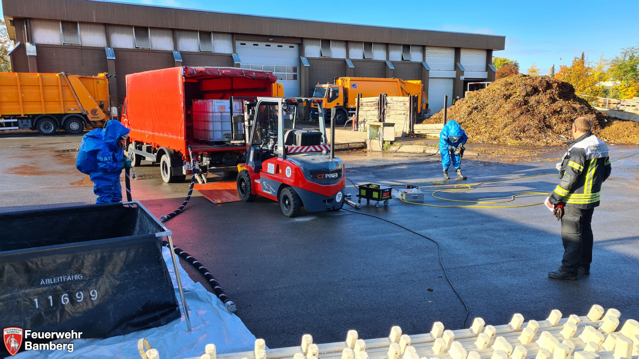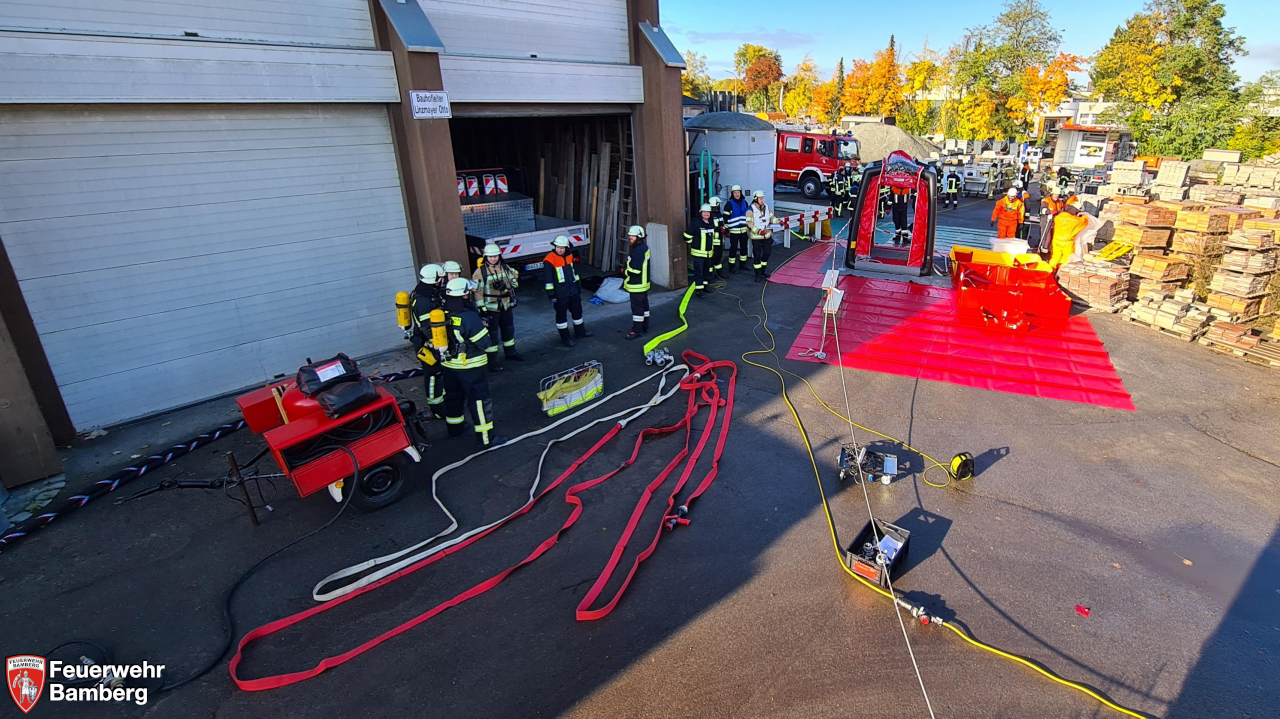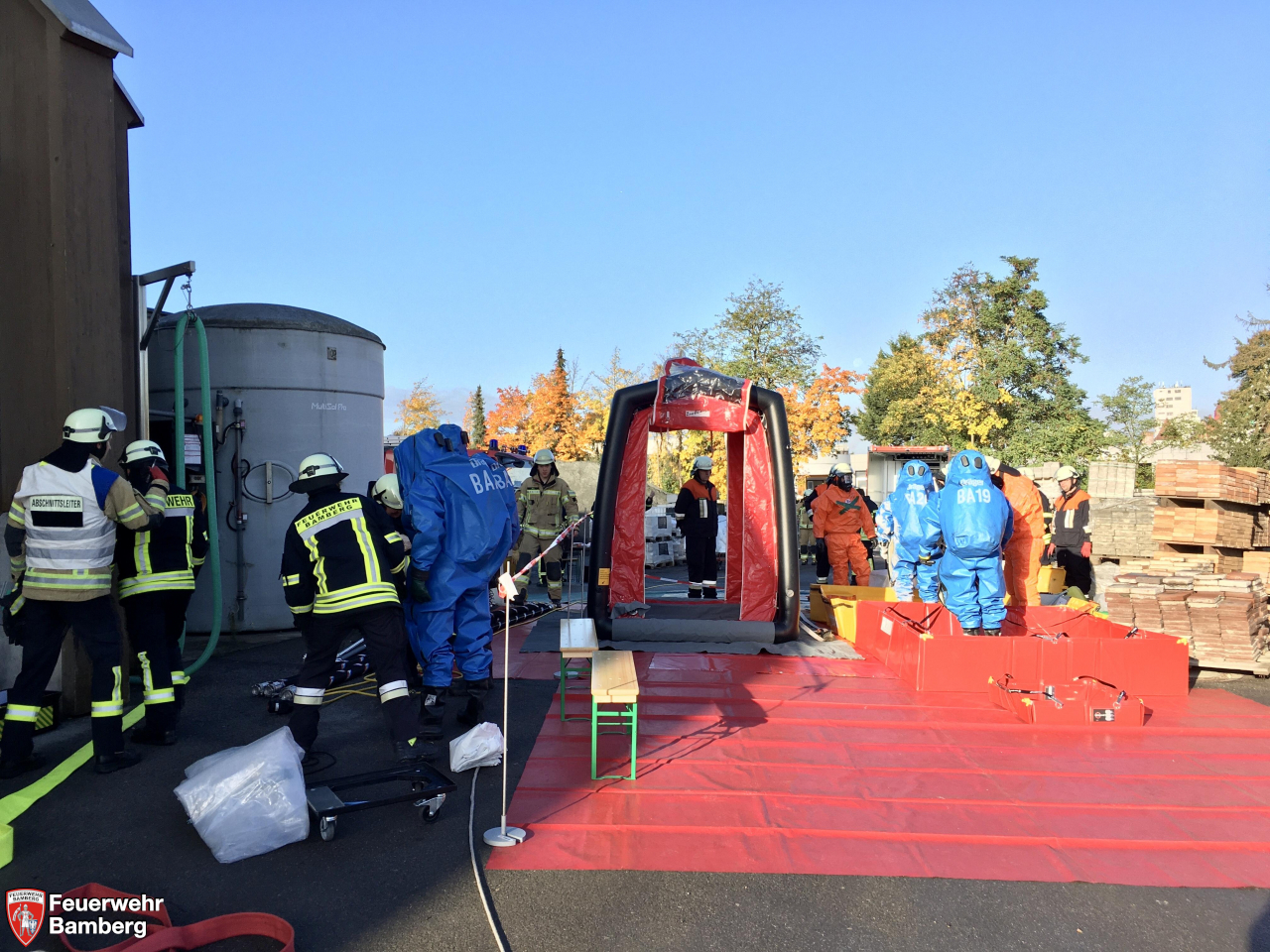 Im Rahmen der heutigen Einsatzübung auf dem Gelände der Bamberger Service Betriebe und der Ständigen Wache wurde geprobt, ob die einzelnen Stationen, die im Zuge der Neuanschaffung des Gerätewagen Gefahrgut (GW-G) im Einzelnen beübt wurden, in einem realistisch dargestellten Szenario auch miteinander harmonieren und Hand in Hand laufen.