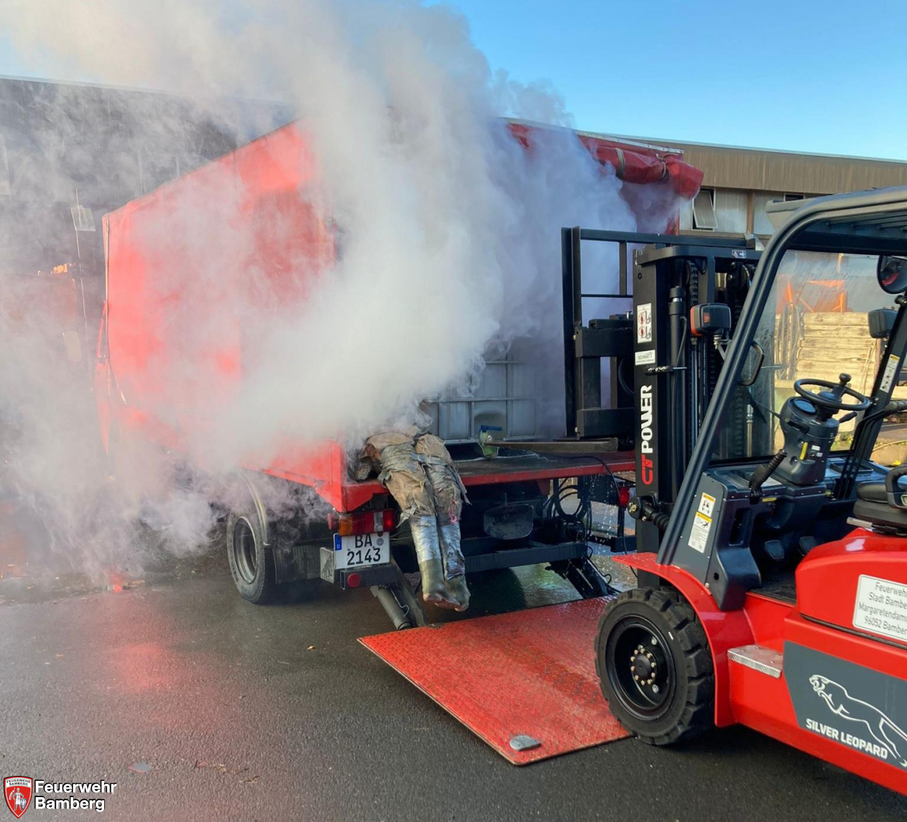 Es wurde angenommen, dass aus einem 1000 Liter IBC-Behälter eine zunächst unbekannte Flüssigkeit ausläuft, dabei Rauchentwicklung entsteht und auch ein Arbeiter verunfallt ist und gerettet werden muss. Die Ständige Wache als erstanrückende Mannschaft übernahm die Schnellrettung der Person unter Atemschutz und den Aufbau der Schnell-Dekon.