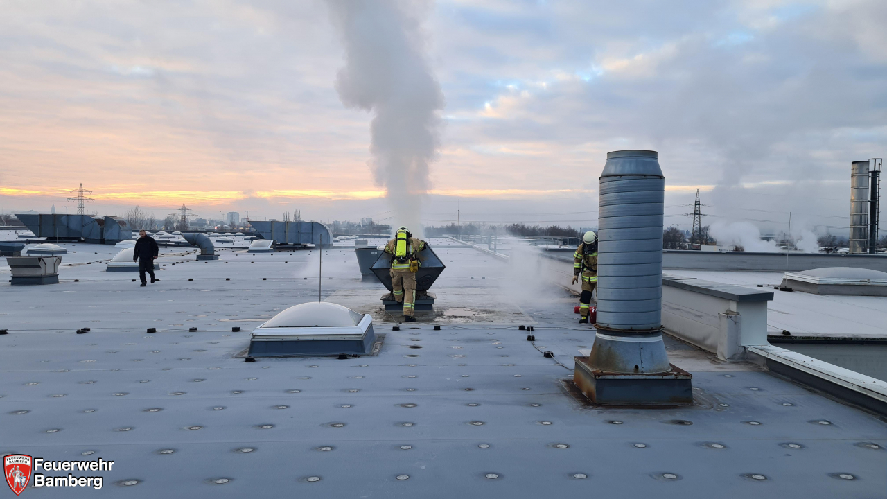 Die Einsatzkräfte der Feuerwehr konnten über eine Wartungsluke in der Maschine zunächst CO2 und im weiteren Verlauf Wasser in den Abzug einbringen. Zeitgleich gelangte ein weiterer Trupp über die Drehleiter auf das Dach und kühlte zuerst mit Wasser, später mit Schaum den Abzug weiter auf Umgebungstemperatur herunter.