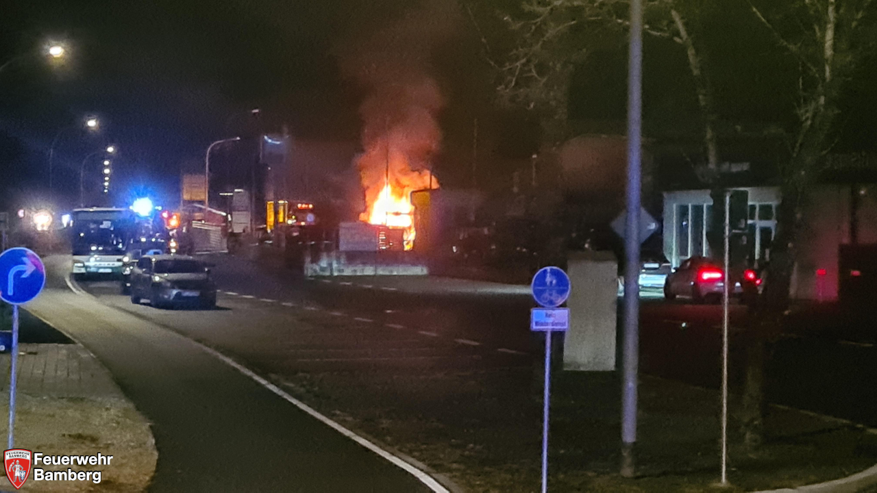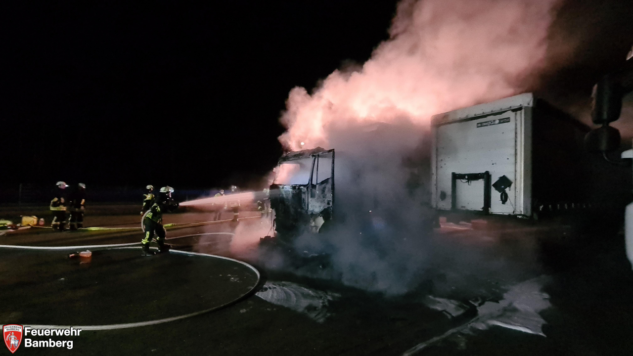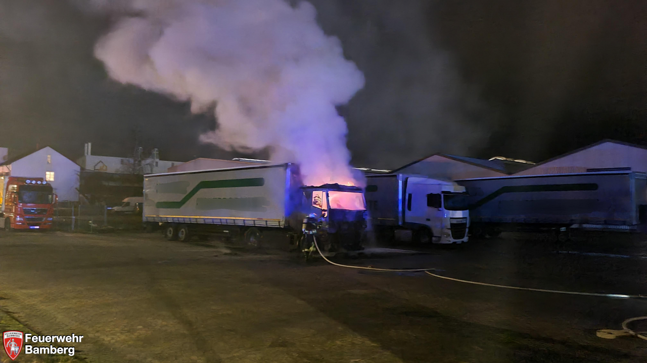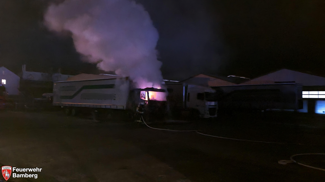 Die ersteintreffenden Kräfte der Feuerwehren Trosdorf und Bischberg leiteten sofort die Brandbekämpfung ein, um eine Ausbreitung auf enggeparkte Zugmaschinen und Auflieger zu verhindern.
