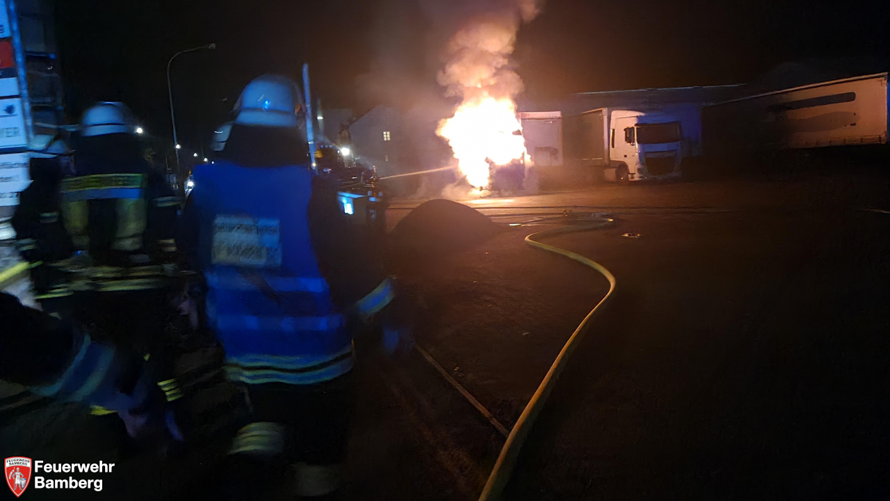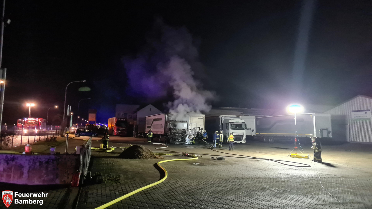 Am Abend wurde die Feuerwehr Bamberg in die Industriestraße im Industriegebiet Trosdorf alarmiert, da hier eine Zugmaschine in voller Ausdehnung brannte. Disponiert waren die Chemieschutzanzüge der Einheit, da die Erstmeldung "brennender Lkw mit ABC-Chemie" lautete.