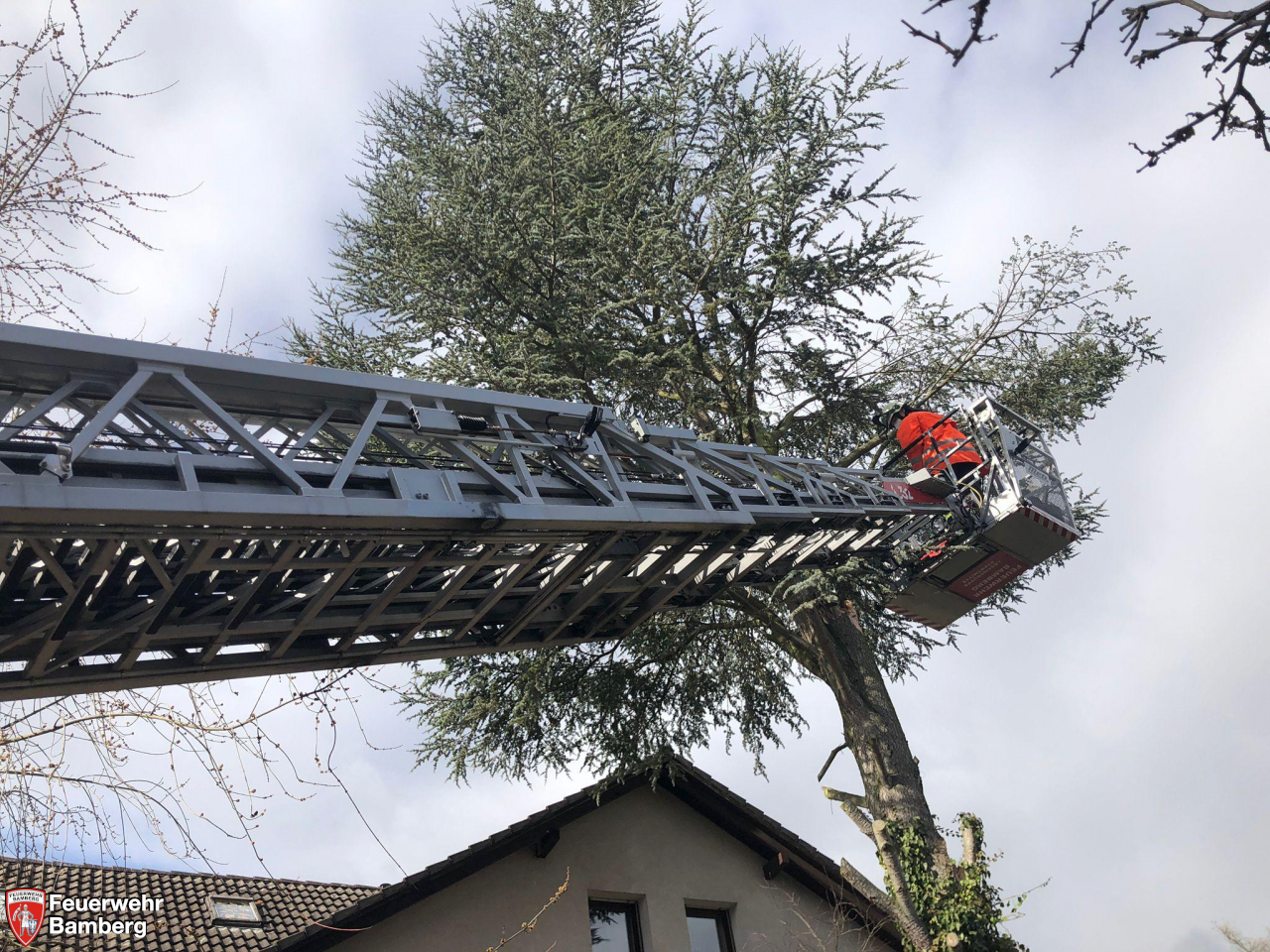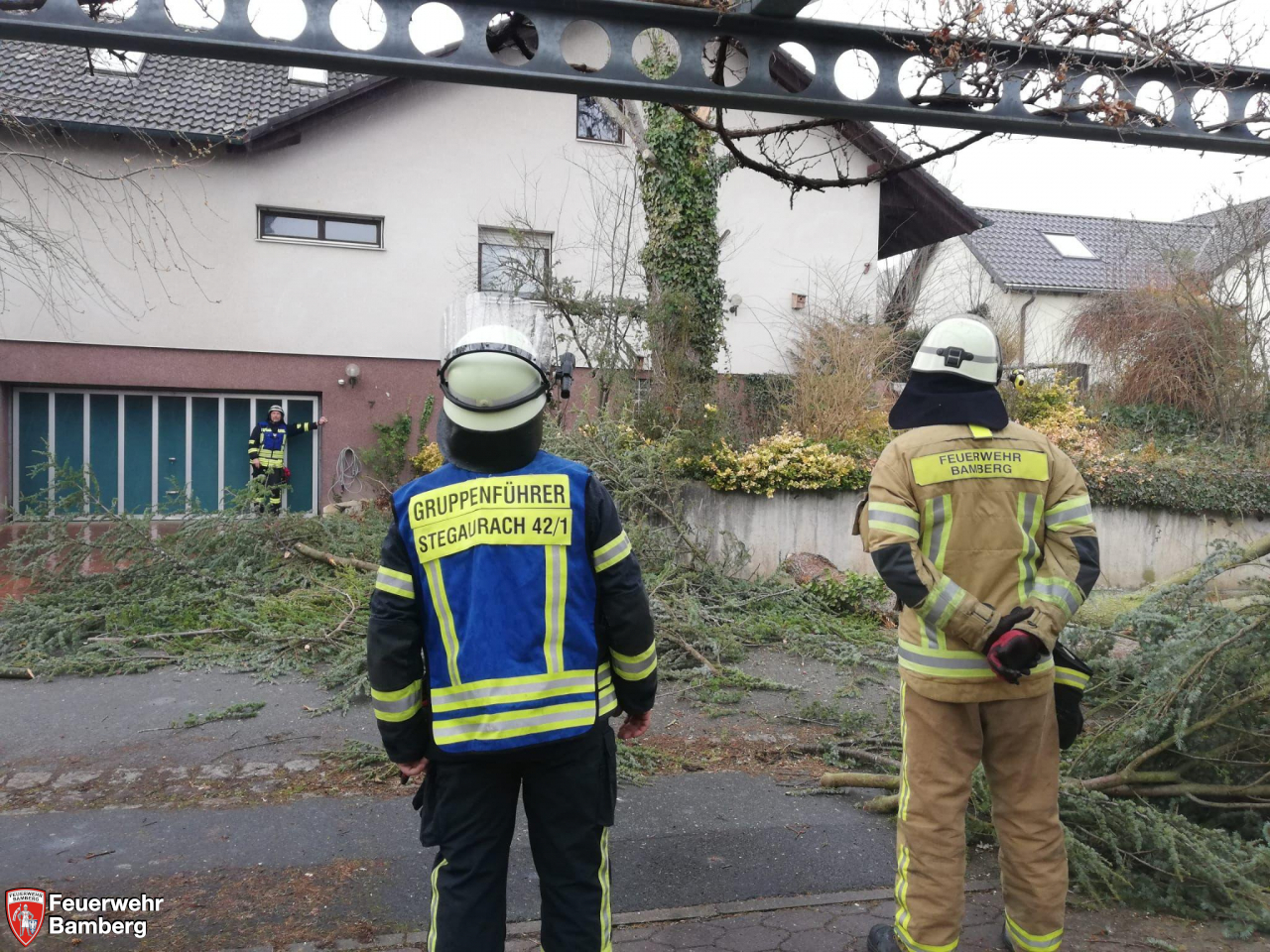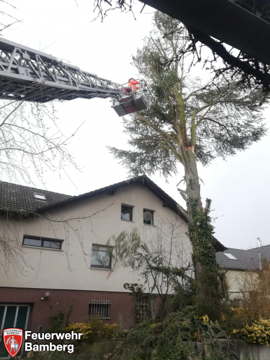 Die Feuerwehr Bamberg wurde aufgrund eines Sturmschadens nach Dellerhof/Stegaurach zur Beseitigung von losen Ästen in einer Baumkrone alarmiert.