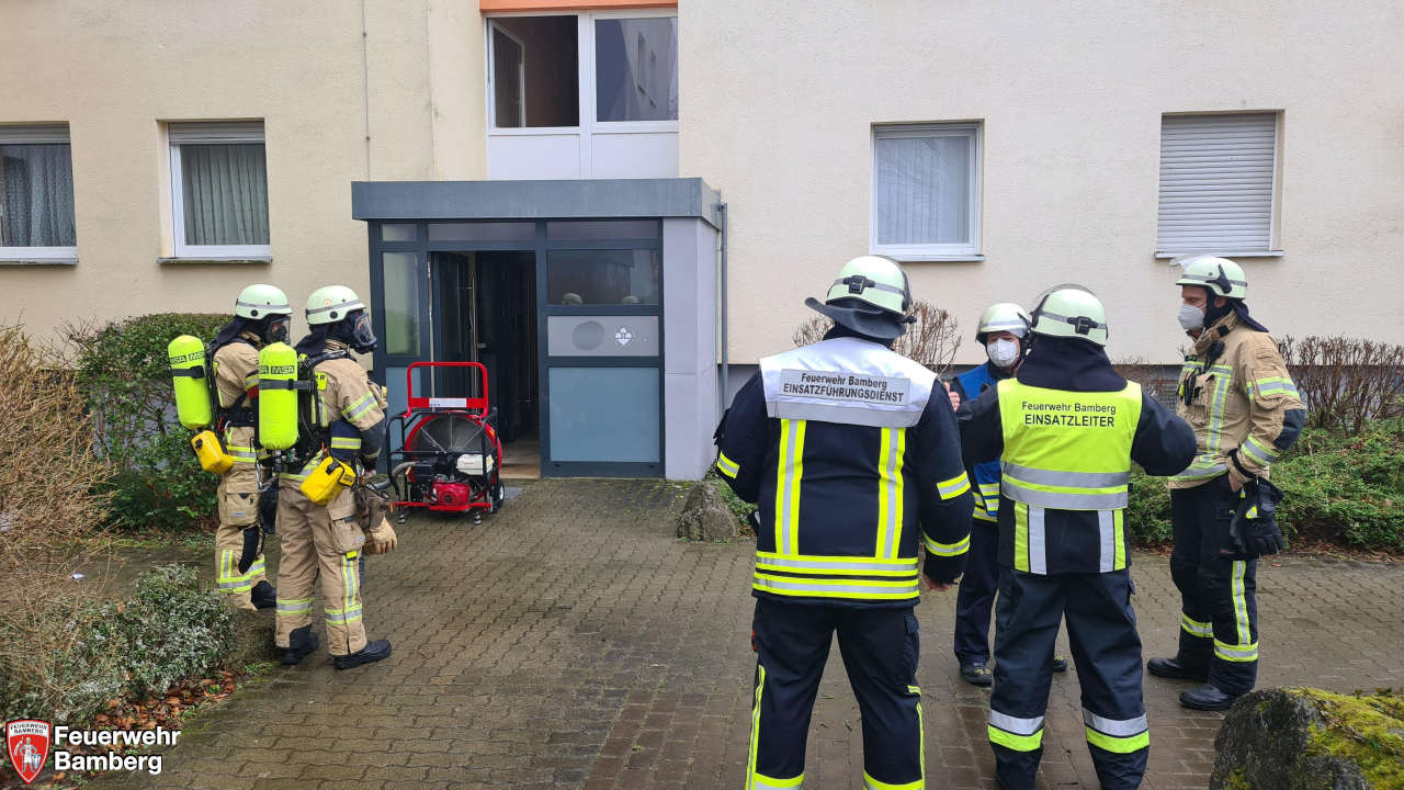 Ein erster Trupp unter Pressluftatmer konnte in einer Wohnung mäßig bis starke Verrauchung feststellen und brachte eine Person aus dieser Wohnung in Sicherheit.