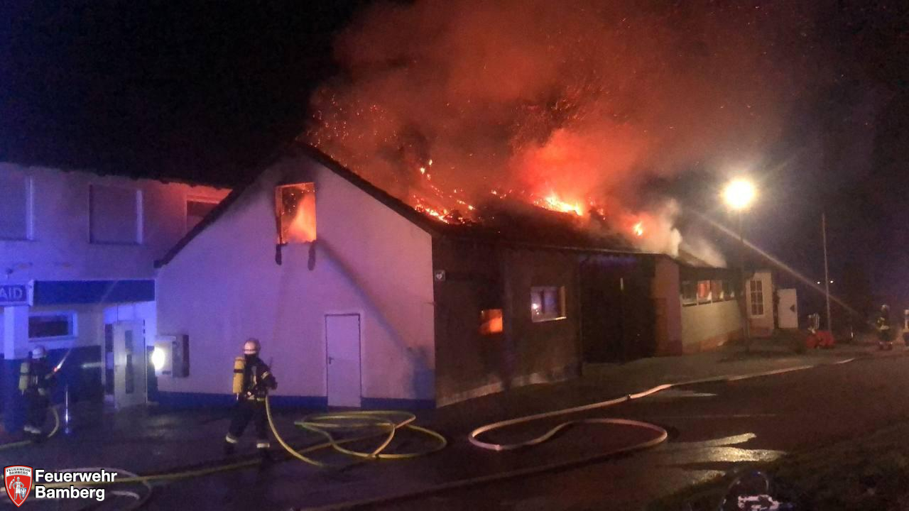 Ein etwa 40m langer Trakt des Sportheimes brannte bereits bei Eintreffen der ersten Kräfte aus Oberhaid in voller Ausdehnung.